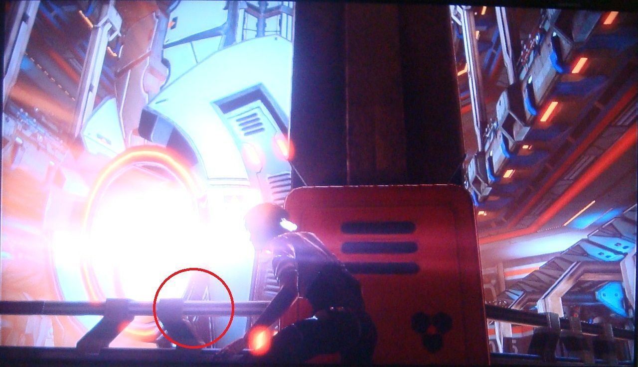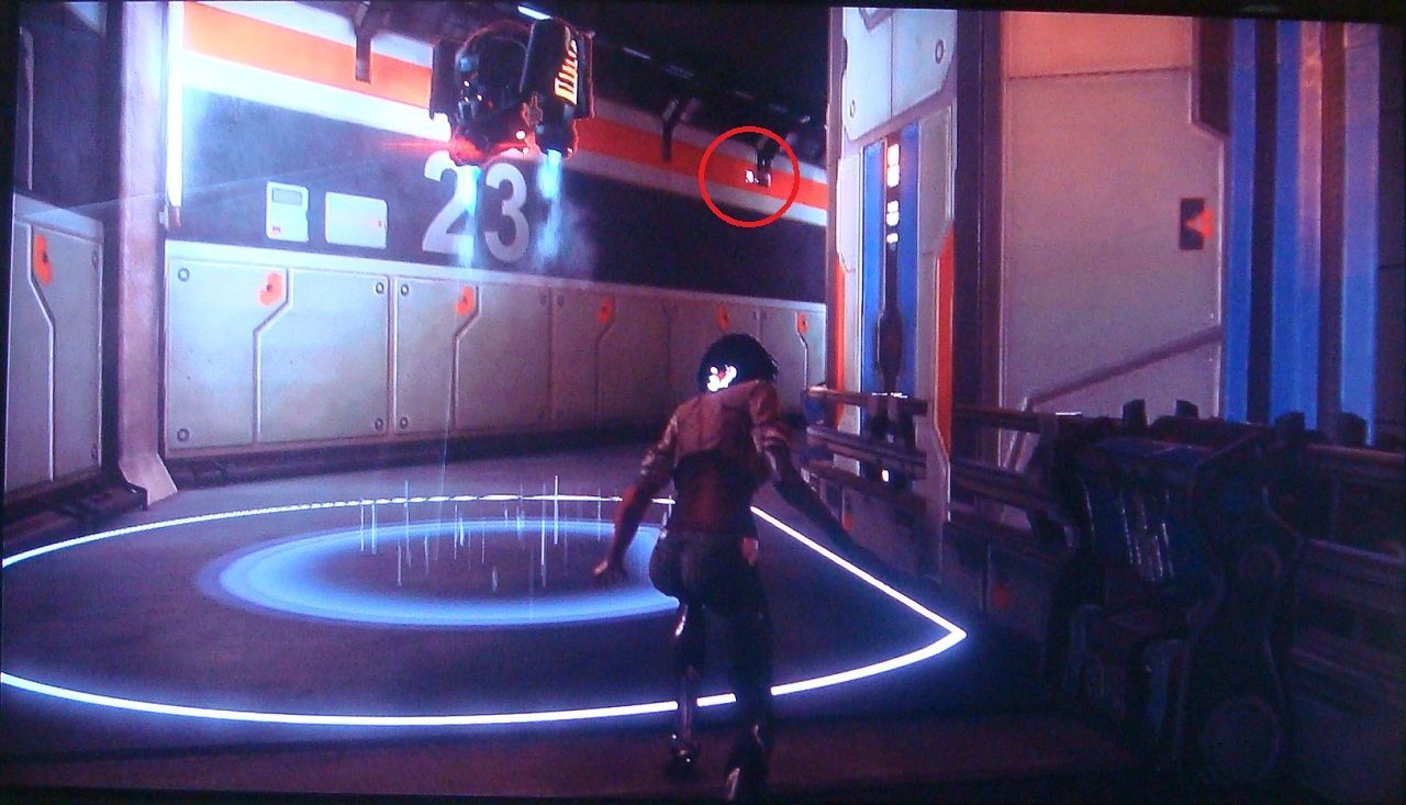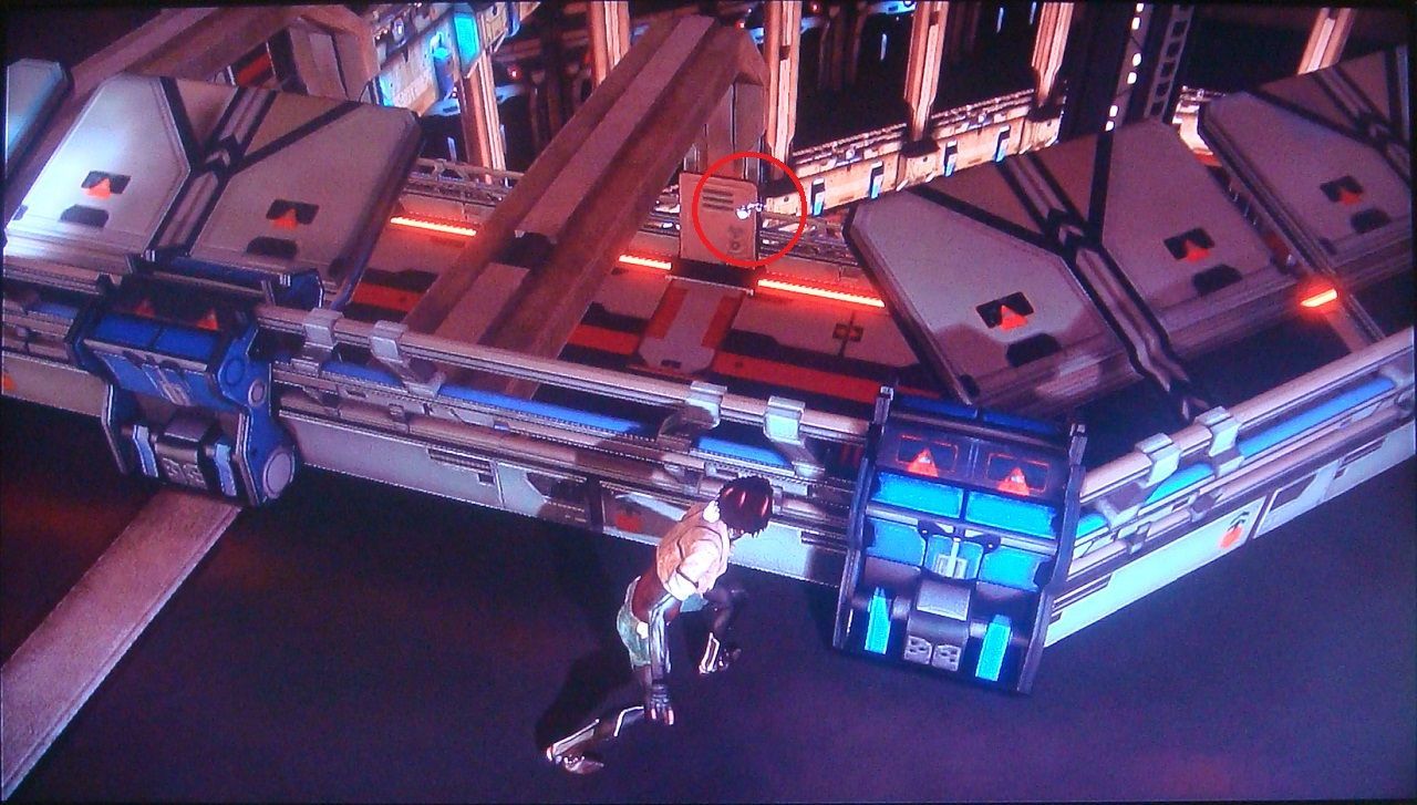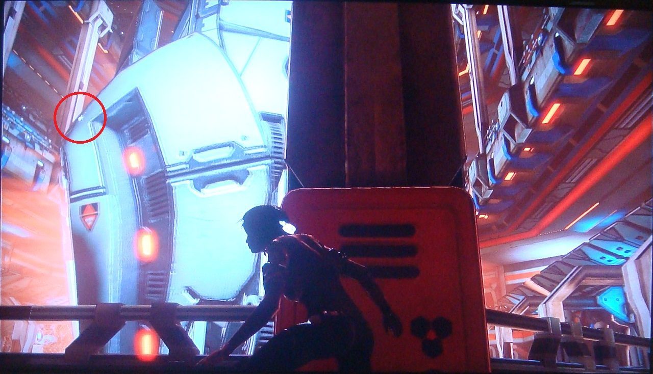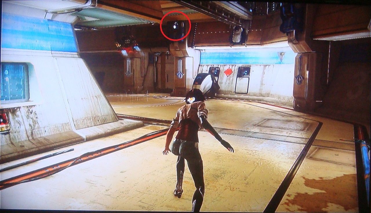 14. En el mismo pasillo azul, baja las escaleras hasta estar frente a la sala técnica. Sigue al robot vigilante que viene por la derecha y busca el scaramech en la parte superior de la pared, en la esquina.