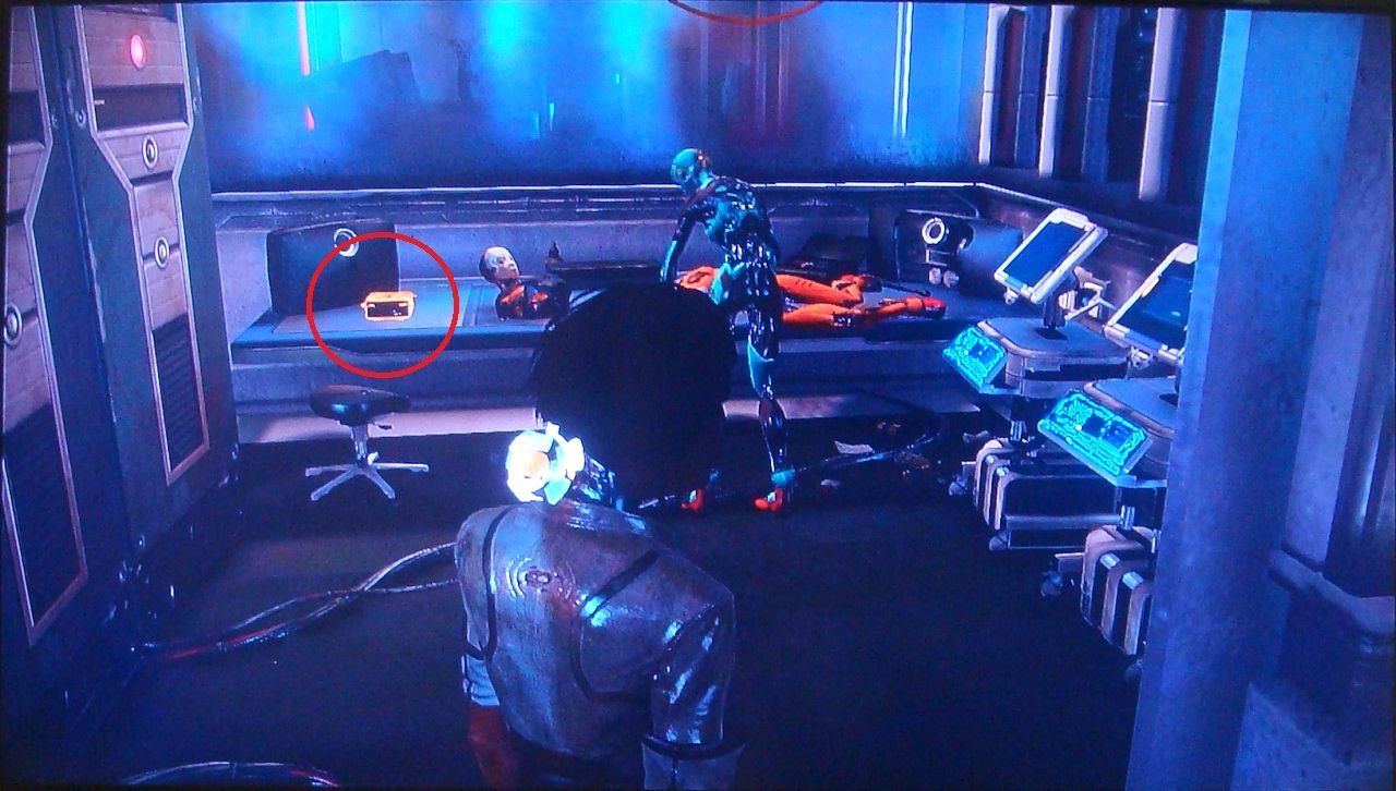 Extrae el paquete de energía al control de la puerta y sal rápido antes de que te quedes encerrado. Regresa al pasillo principal, yendo hasta el fondo por la izquierda para disparar al scaramech que hay entre el sofá y la pared.