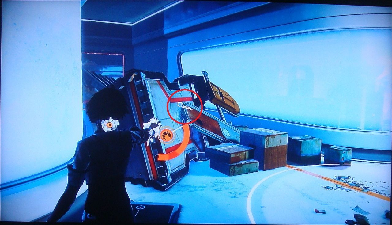 51. Dispara un Junk Bolt a los daños estructurales que hay al lado de la puerta por la que has entrado al puesto de seguridad principal. Esto hará que caiga el cuadro y quede el scaramech a la vista.