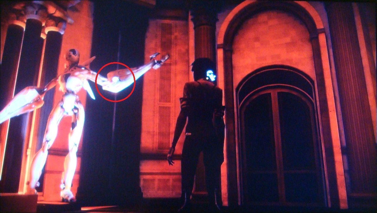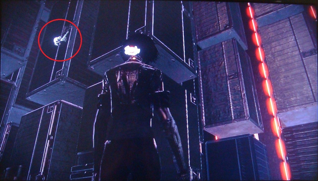 Tras la conversación con Edge, da media vuelta y ve hasta el final del pasillo para encontrar un scaramech en el brazo de la última estatua.