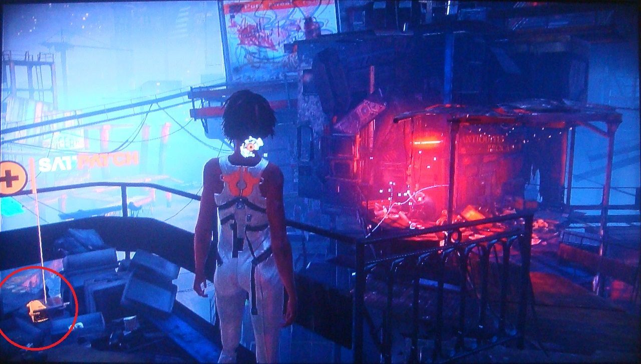 13. De vuelta al Slum 404, trepa a la caseta que hay a la izquierda del drone de entrega, justo antes de llegar al Leaking Brain.
