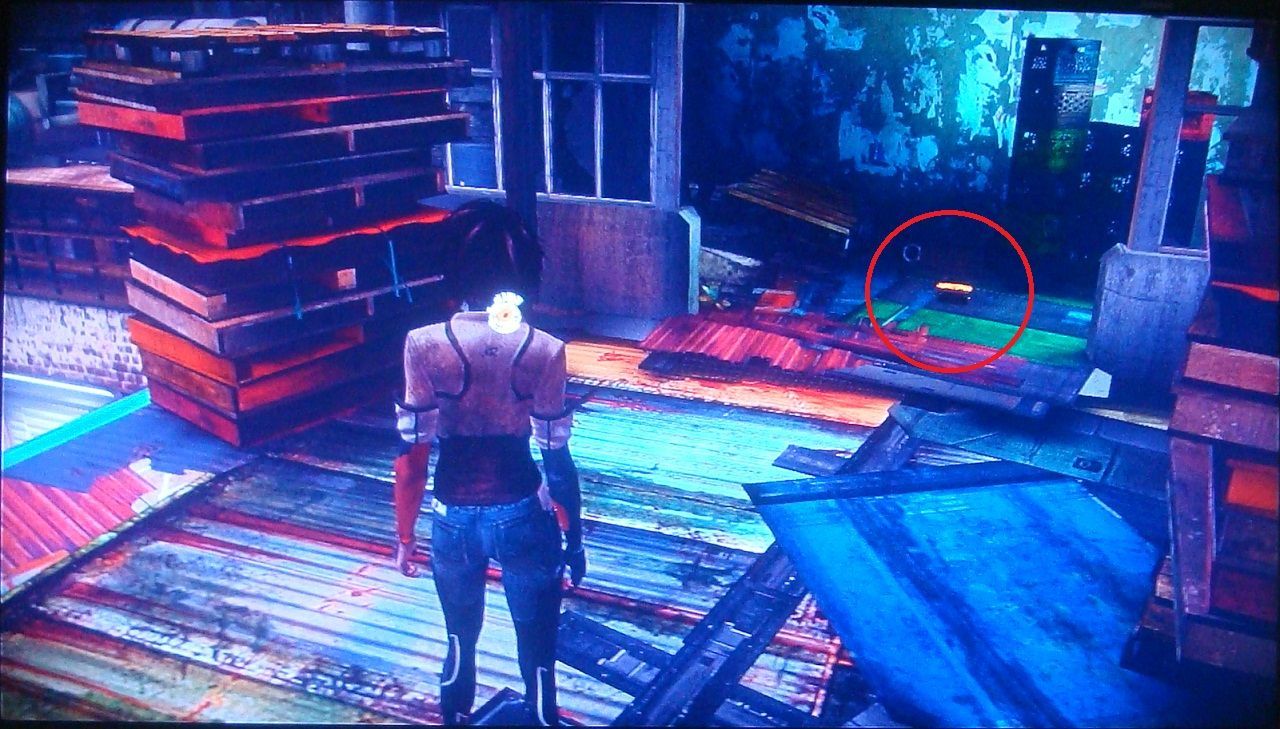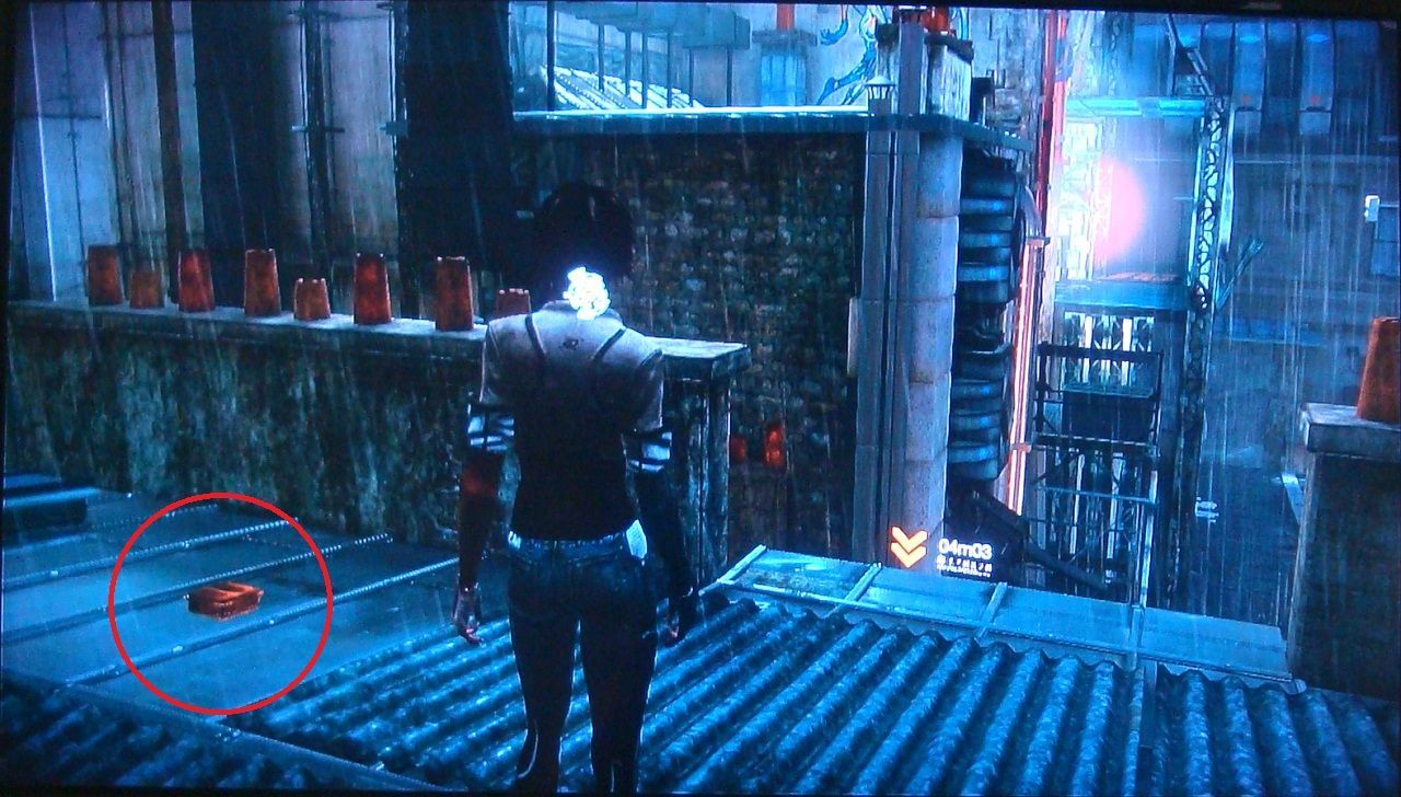 23. La tercera vez que llames a un vehículo, detenlo frente al número 05 pintado en la pared. Salta a la cornisa y sigue las flechas naranjas que te llevarán a una nueva zona. Busca entre los contenedores del fondo.