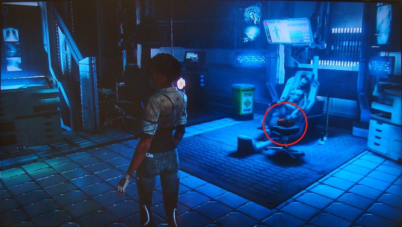 25. En los servicios. La primera puerta a la derecha, tras cruzar al pasillo de administración en la sala cuadrada donde patrullan los dos robots de vigilancia.