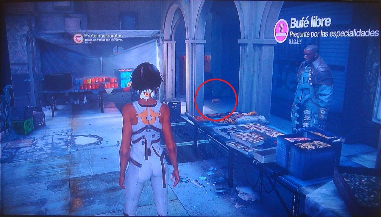 10. Antes de abrir la puerta del mercado, ve por la derecha y búscalo sobre un sofá.