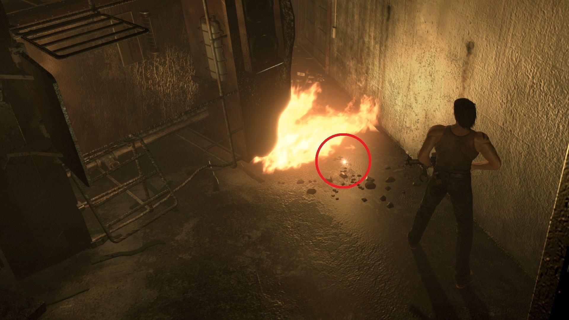Desciende al alcantarillado y avanza. Seguramente aquí tengas disponible la escopeta. Trepa al margen y sal por la puerta; afuera te espera un buen puñado de hunters que no te lo pondrán nada final. Da lo mejor de ti y, al acabar, ve por la izquierda para encontrar la llave del fuego.