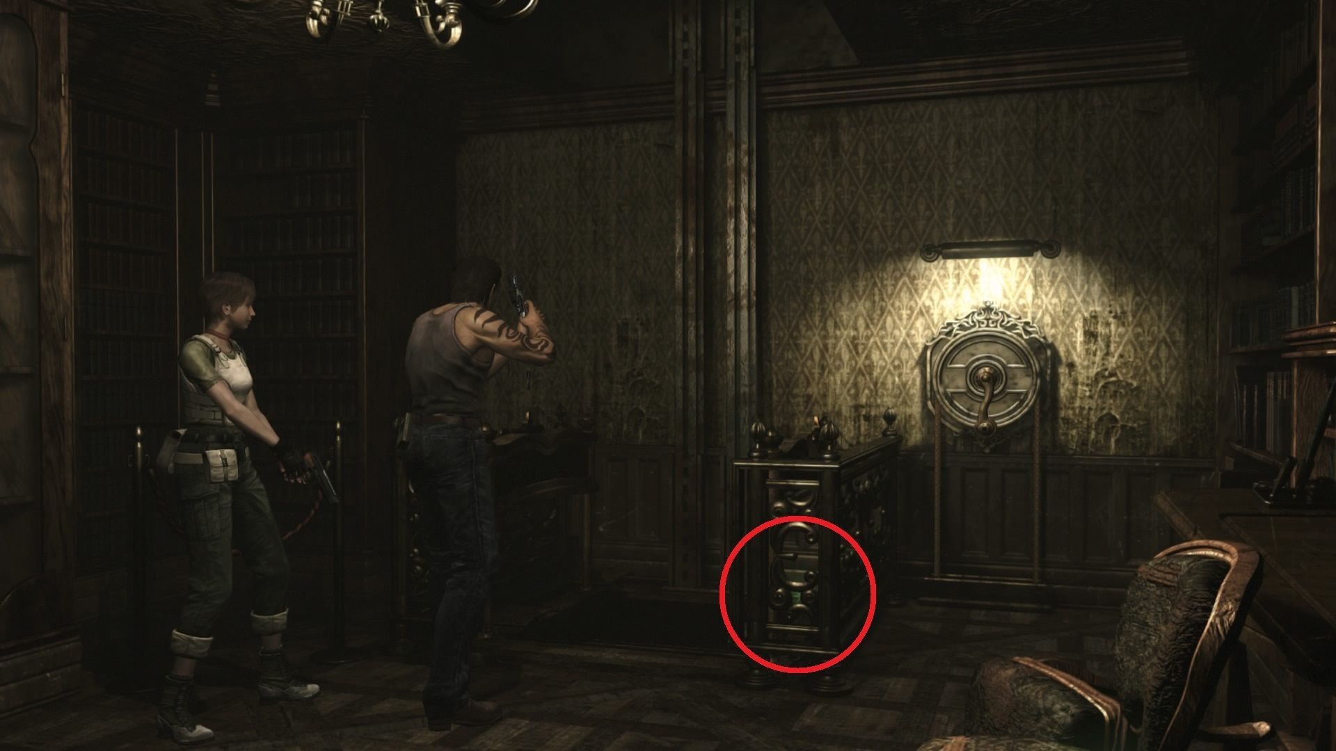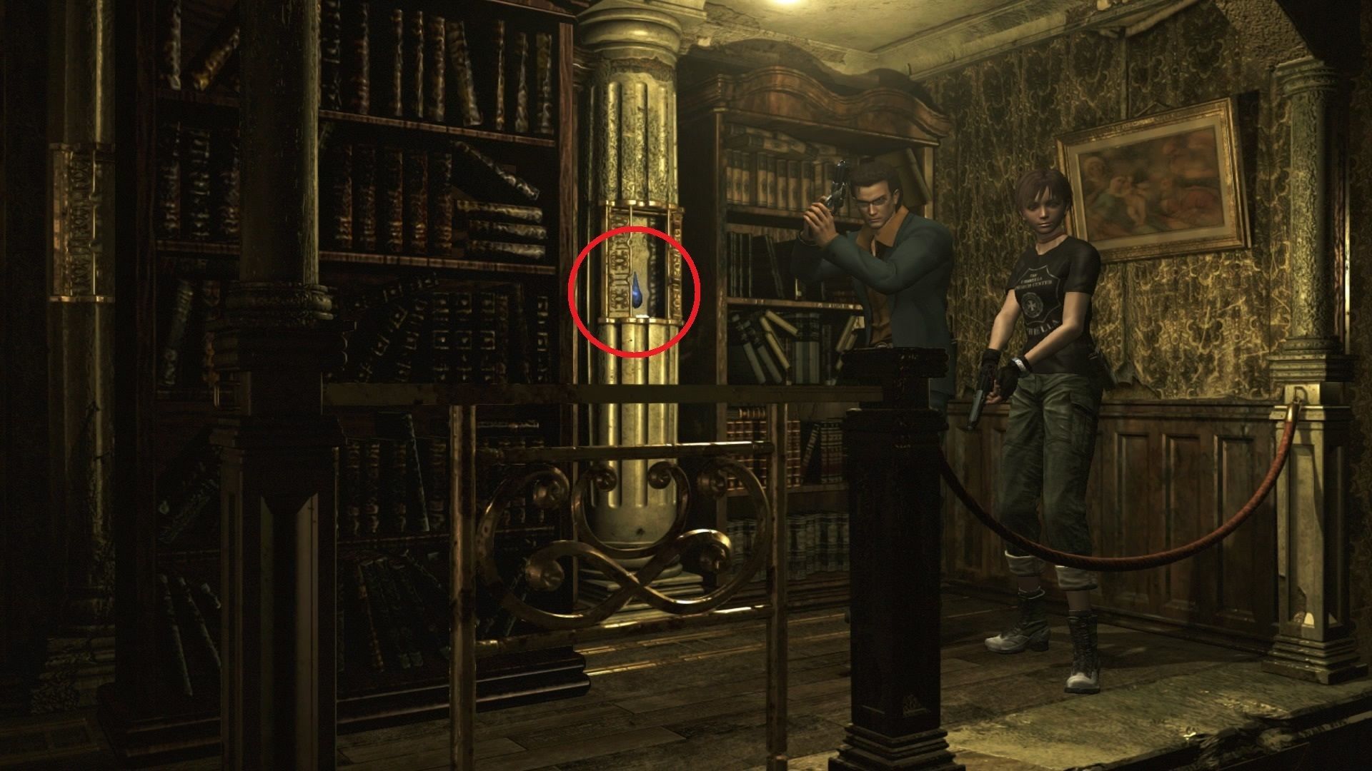 Baja las escaleras, mata a las arañas y entra por la puerta. Aquí encontrarás el lanzagranadas (o cualquiera de las otras armas que te falten). Liquida a las cucarachas, sal al pasillo y ve por la puerta doble del fondo. No hay nada que matar aquí, pero así tendrás la estancia marcada para más tarde. Vuelve por el corredor haciendo todo el camino inverso hasta regresar al vestíbulo, junto a Rebecca. Equípate lo mejor que tengas y baja por la escalerilla del lado izquierdo.