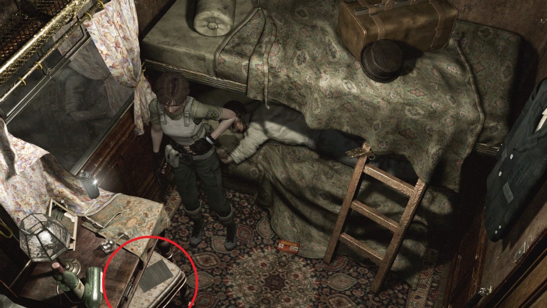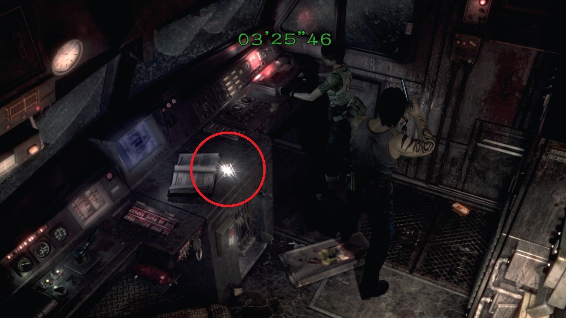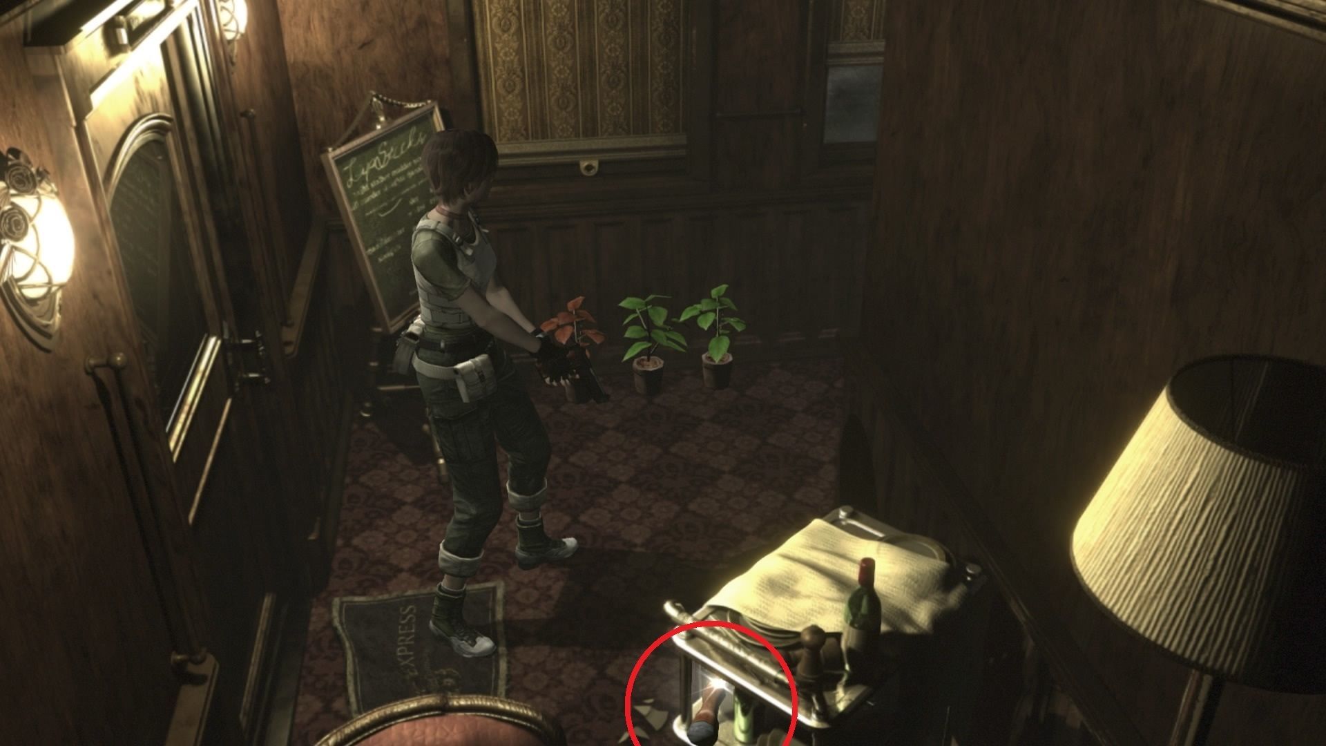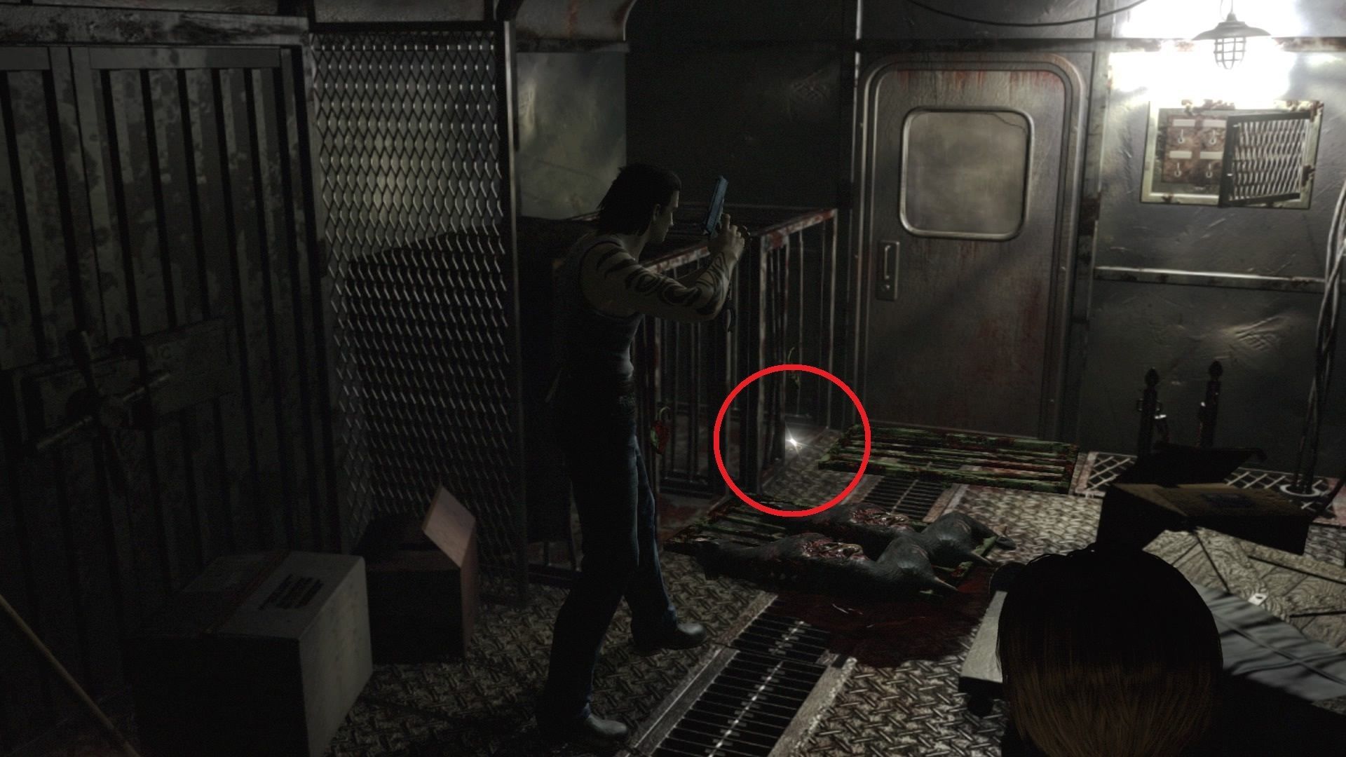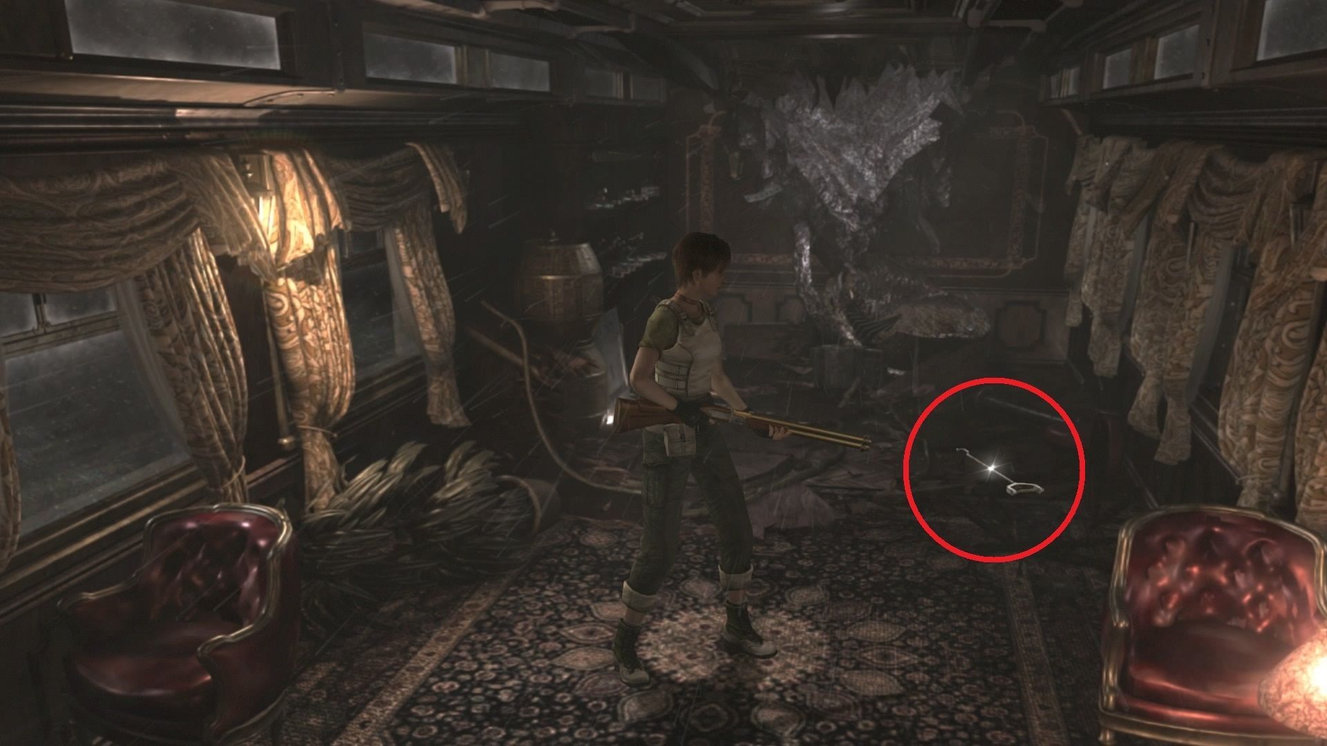 Recorre todo el techo del vagón hasta encontrar unos cables rotos; únelos. Caerás a la cocina. Coge la hierba verde y la munición de pistola. Ve en dirección a la pantalla para encontrar un spray de primeros auxilios y una llave del tren.