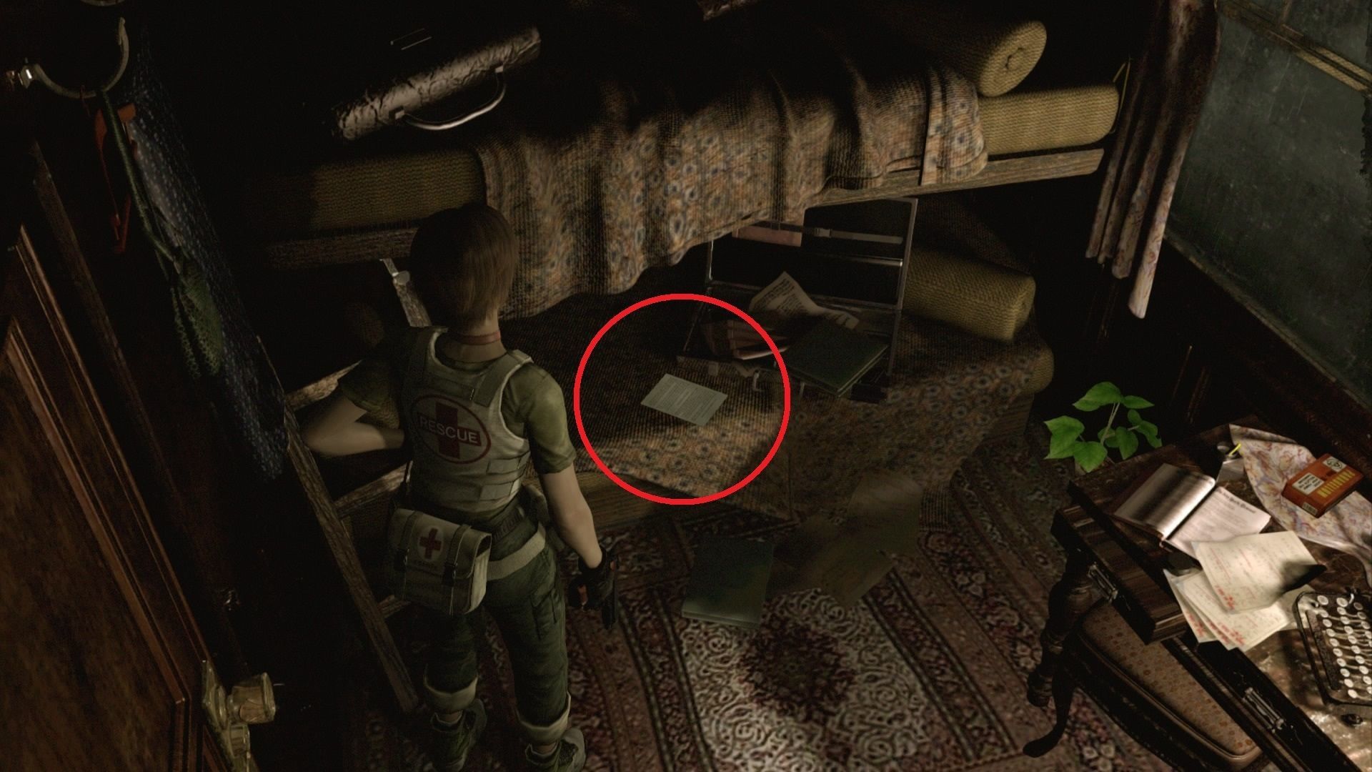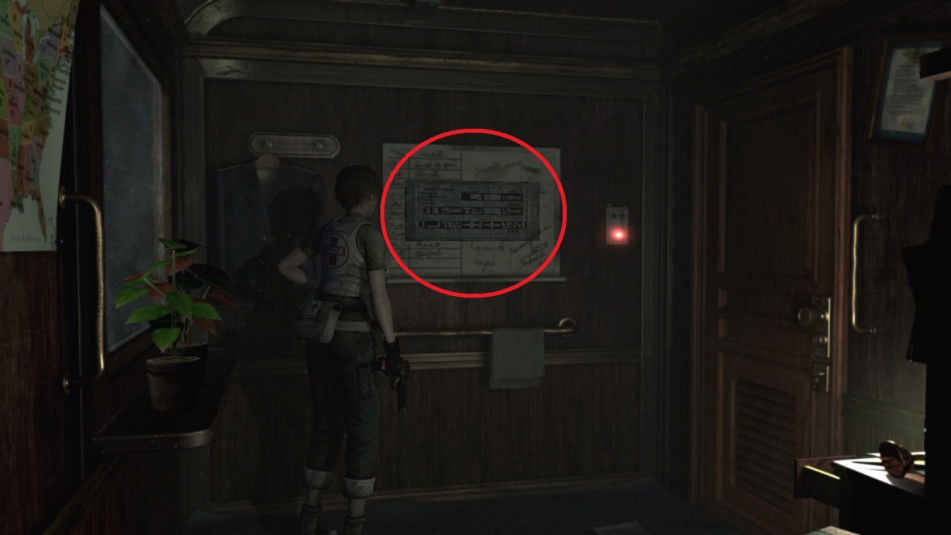 Sal al pasillo y entra por la siguiente puerta, la 201. Esta es una habitación de guardado, aquí puedes guardar tus progresos en la máquina de escribir usando una cinta de tinta. Tienes otra justo al lado. Recoge también la munición de pistola, la hierba verde y las órdenes de investigación en el lado opuesto de la sala.