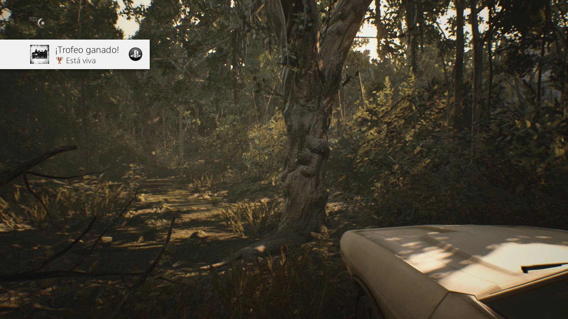 Tras esta primera escena verás a Ethan conduciendo por Luisiana en dirección hacia la Casa de invitados de los Baker. Nada más bajar del tomarás el control del personaje y conseguirás el Logro / Trofeo Está viva.