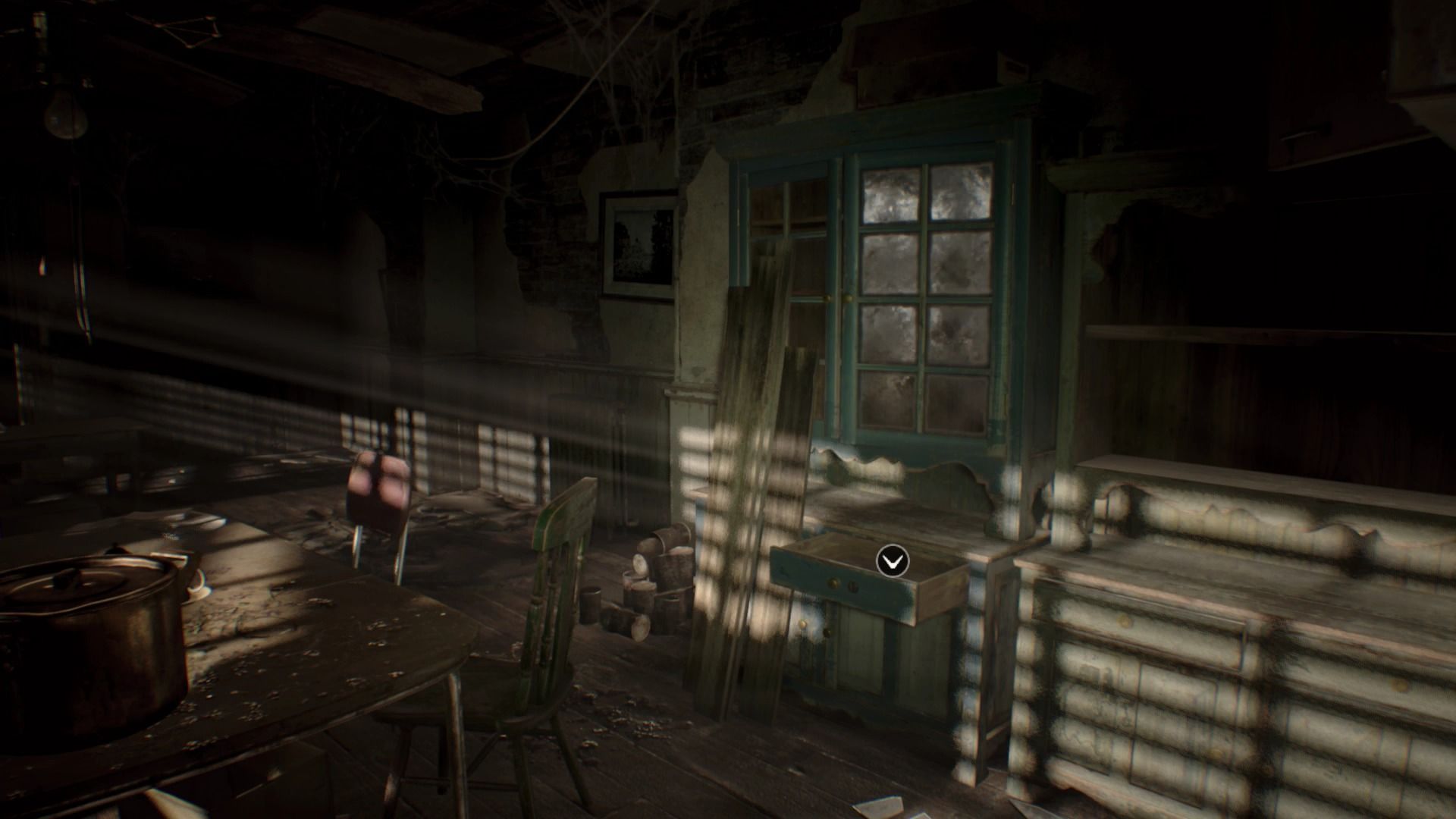 Una vez que hayas completado la cinta vuelve a la cocina y examina el cajón que acabas de abrir para encontrar la Moneda antigua 1 en su interior. Vuelve a la sala de estar y examina el tirador de la chimenea para poder entrar en el pasadizo que viste en el vídeo y baja por la escalera para llegar al sótano.