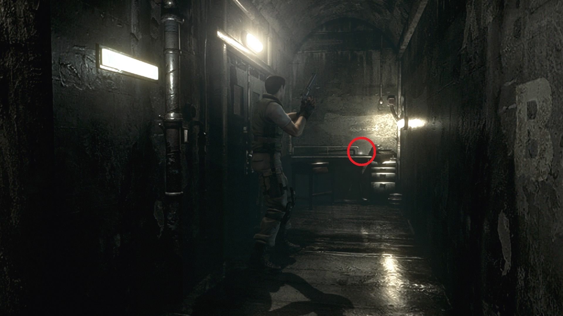Sal al pasillo y ve hasta el fondo, donde podrás pulsar un interruptor para llamar el ascensor. Si salvaste a Rebecca cuando gritó, vendrá contigo. Al llegar, coge la munición de escopeta y cruza la puerta.