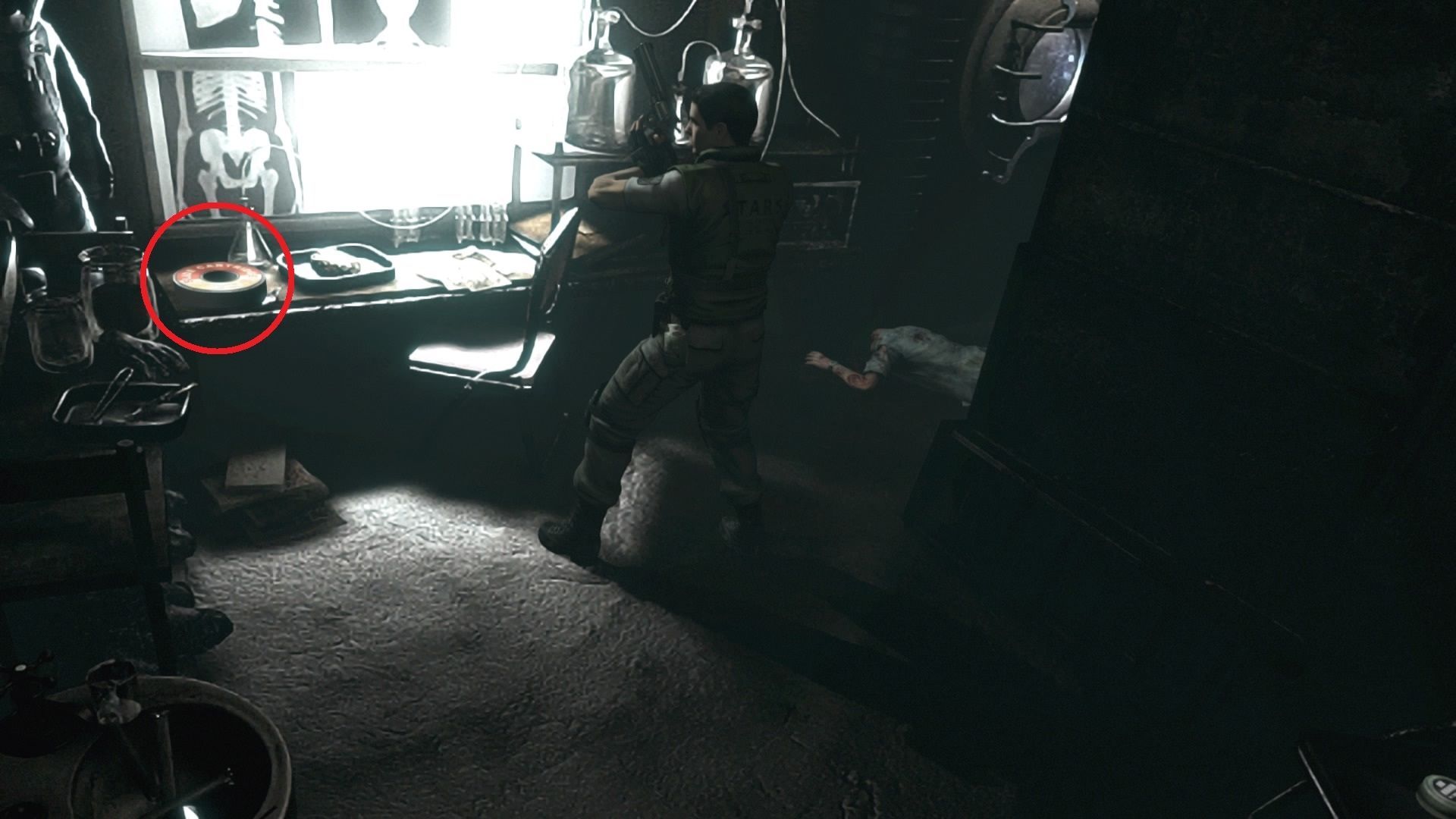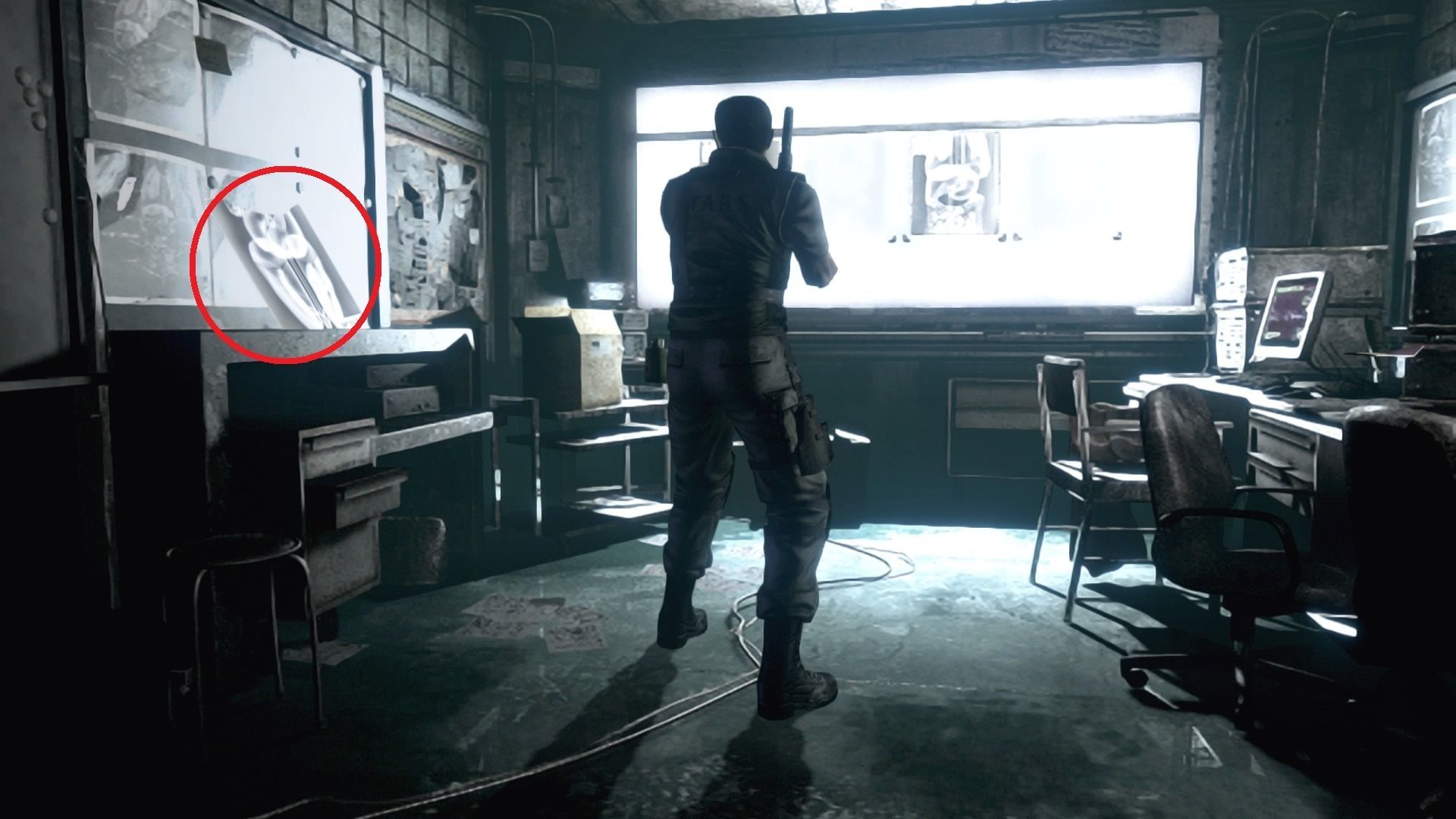 Sigue por la puerta al pie de las escaleras y entra por la que tienes justo al lado. Quédate el botiquín y cruza la puerta de la derecha. Sobre el escritorio tienes una carta del científico que puedes leer. Coge las dos radiografías...