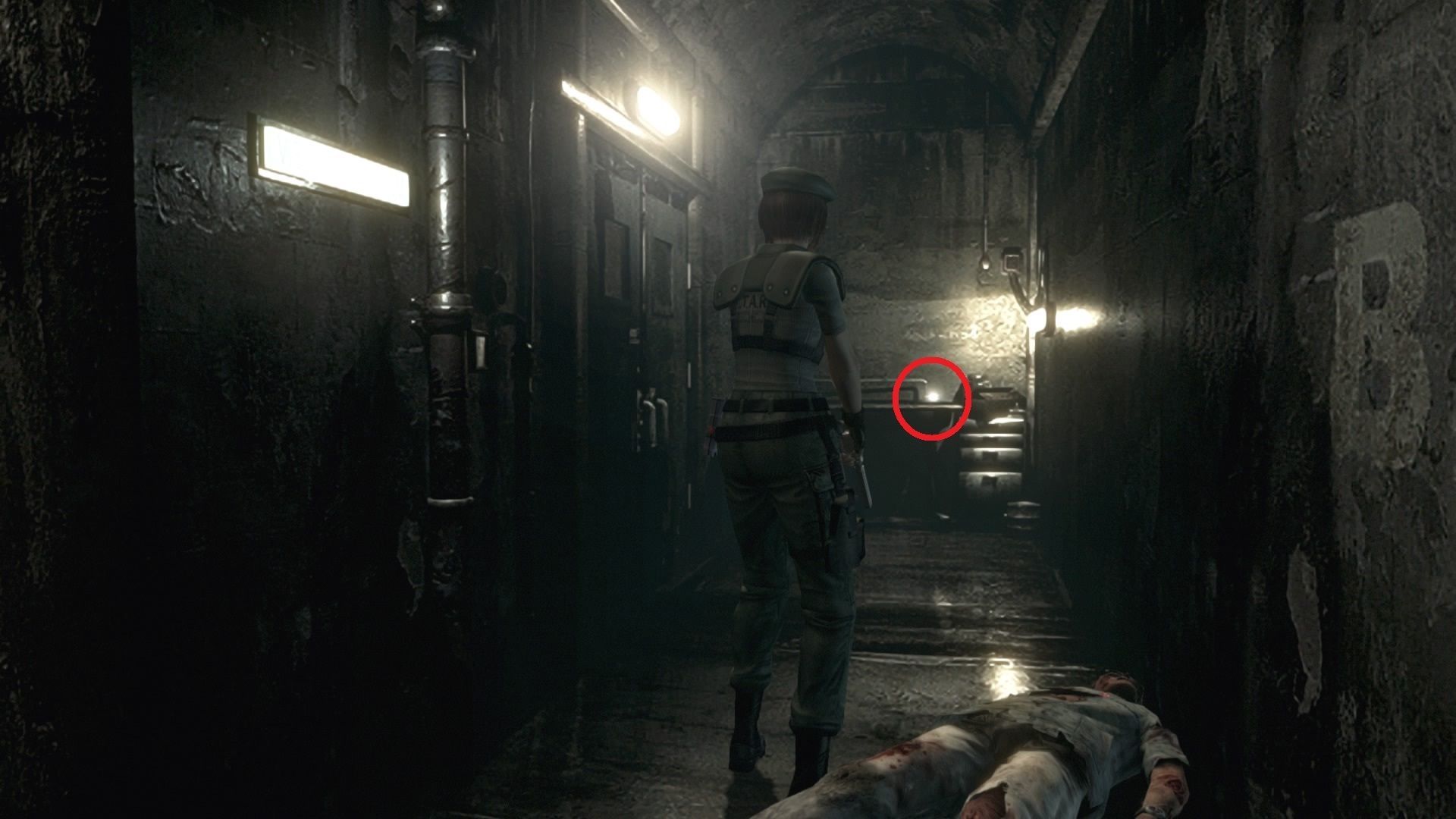 Con Chris ya a tu lado, dirígete a las escaleras que llevan a la planta superior y guarda partida en la máquina de escribir. Luego, sal del laboratorio. Tras la escena, abre la puerta y recoge los suministros. Sigue adelante, coge el fusible al final de la pasarela y colócalo en el hueco de la pared. Verás una cinemática y empezará una cuenta atrás de 3 minutos.