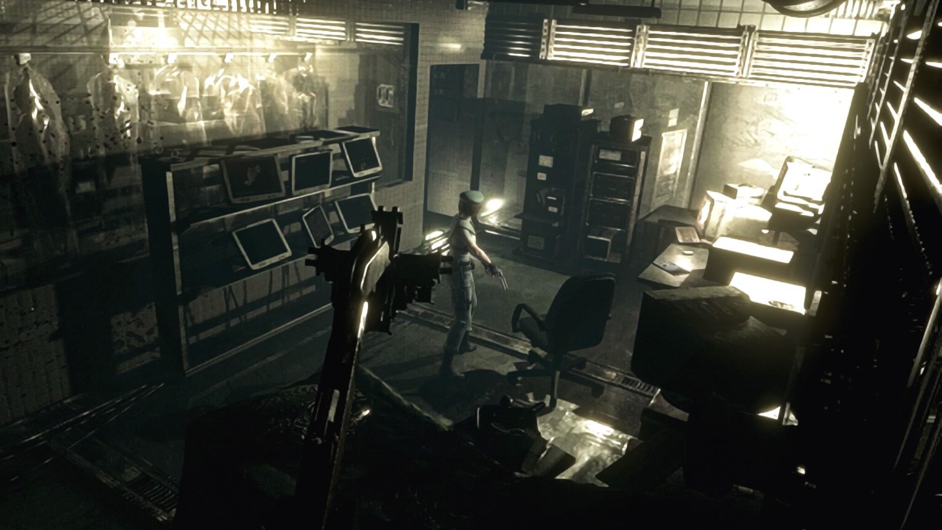 Rodea la estancia y baja por la escalerilla. Guarda partida. Este es el tramo final, así que no sigas sin la magnum encima. Cruza la puerta, mata a los dos zombis y coge las hierbas verdes. Antes de bajar las escaleras, ve por el pasillo de la izquierda para recoger un disquete MO.