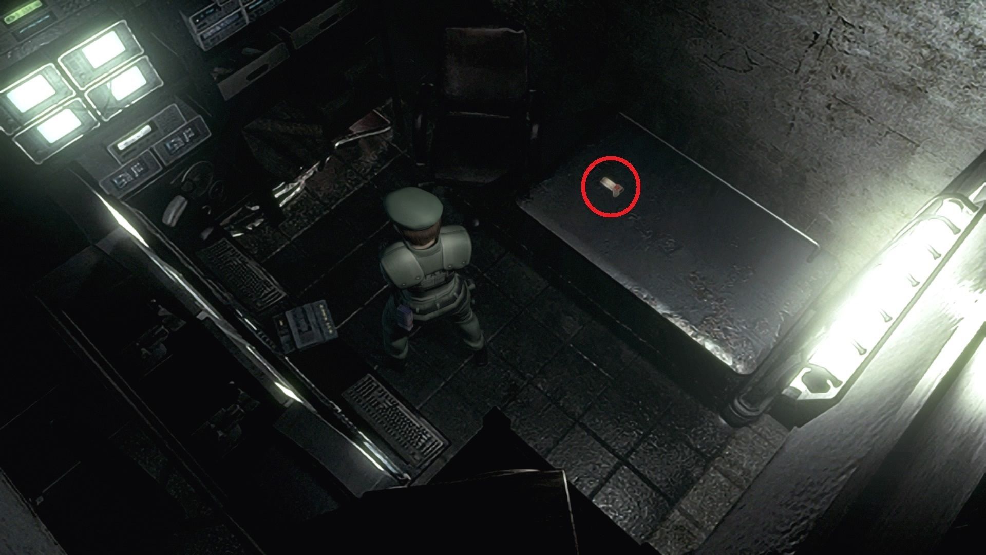 Quédate el spray medicinal y la munición de escopeta. Examina los armarios con vitrina para encontrar el mapa de LABORATORIO y, en el estante, coge un disquete MO.
