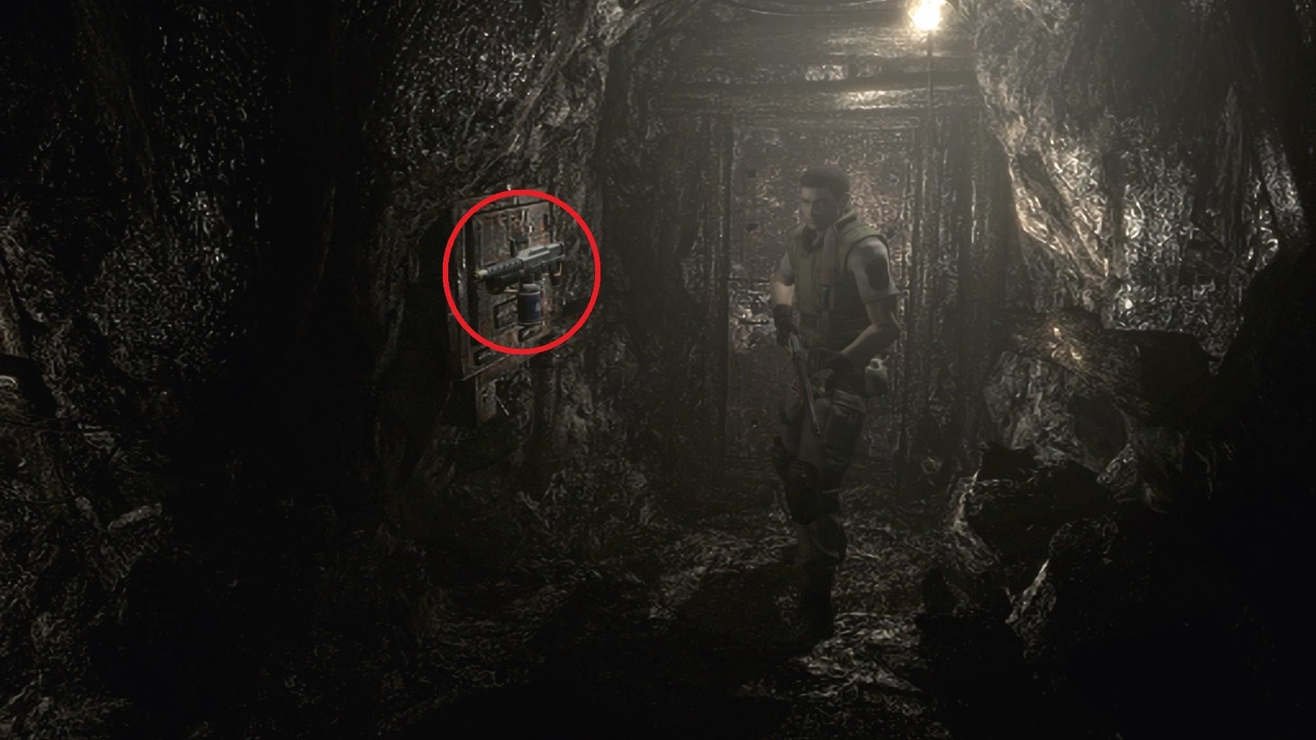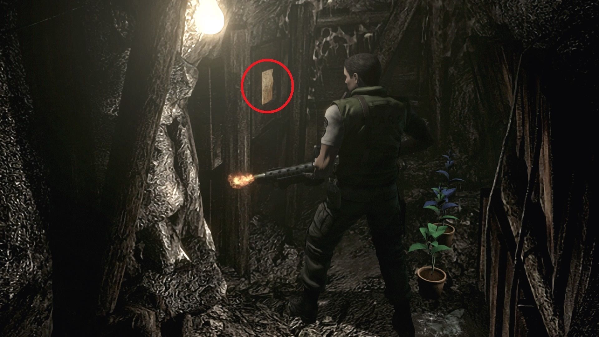 Vuelve sobre tus pasos hasta el primer túnel. De camino te encontrarás un par de Hunters, así que ve con cuidado. Una vez allí, ve en la dirección que todavía no has explorado para encontrarte una hierba azul y, un poco más allá, una máquina de escribir y un baúl. Guarda partida. Frente a la hendidura de al lado, utiliza la manivela hexagonal. Cruza, coge la hierba verde y abre la puerta.