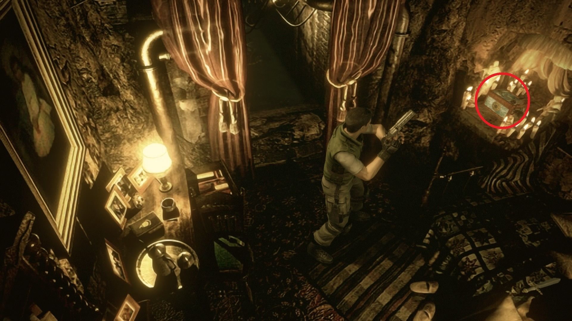 Justo al otro lado hay una máquina de escribir y, escalones abajo, un baúl. Guarda partida y cárgate de munición, porque puedes necesitarla en el siguiente enfrentamiento. Sigue bajando las escaleras y abre la puerta. Desciende un poco más y se disparará una cinemática.