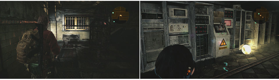 Desde el mecanismo con pinchos donde se separaron Claire y Moira, en la pared de enfrente antes de entrar a la sala del mecanismo.Bien, volvemos arriba y avanzamos por la puerta del fondo, pasamos la sala de control que esta bloqueada por el otro lado, avanzamos por el pasillo y llegamos a la zona donde teníamos escaleras para bajar por ambos lados hacia donde activamos la energía con Claire y Moira, de hecho nuestro objetivo es llegar hasta allí para cortar la energía y poder llegar la zona de las celdas donde pusimos el engranaje (ya que las cuchillas giratorias del anterior capítulo nos impiden el paso hasta ahí) pues nada a bajar hasta la energía, al pasillo donde salió el primer cabeza de hierro y había 3 cuchillas giratorias