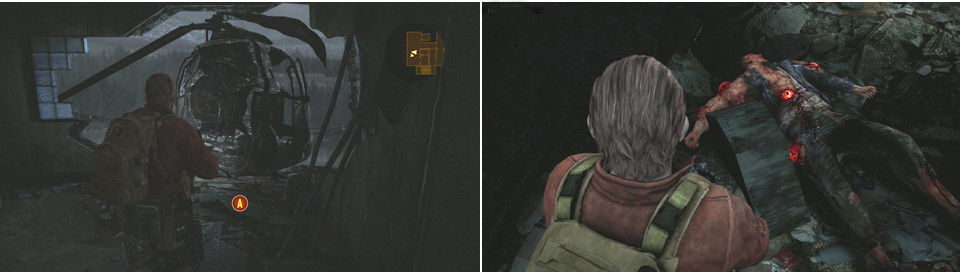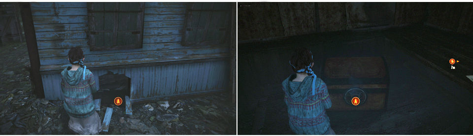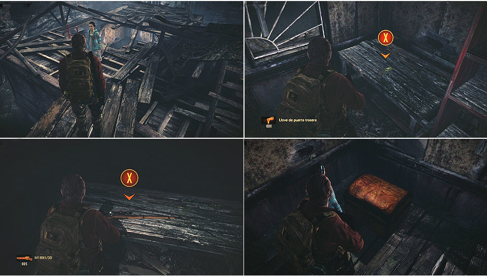 Al subir las escaleras avanzamos y miramos por la izquierda antes de cruzar la tabla, en las rocas.Cruzando por la tabla llegamos hasta un tejado roto para tirarnos dentro de una casa, dentro encontramos un nuevo arma M1891 un rifle de francotirador, la llave para la puerta metálica de antes y la segunda Caja Trucada (Kit de Mejora).