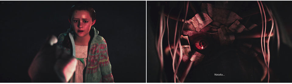 Volvemos y usamos la llave, llegamos hasta una rampa que nos lleva al pueblo donde estuvimos antes con Claire y Moira, Natalia nos advierte sobre algo pero no ve nada.