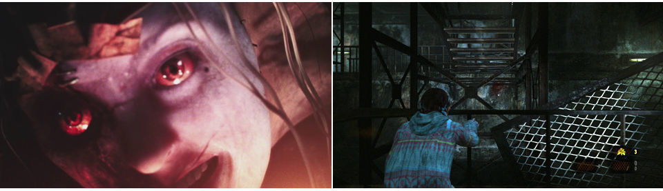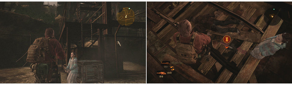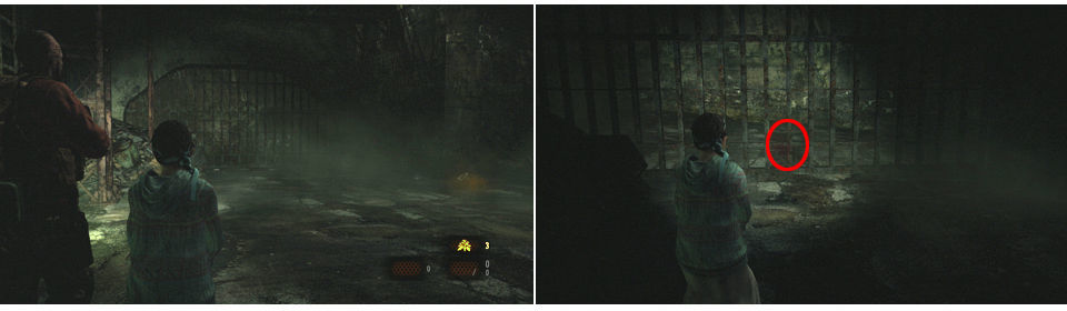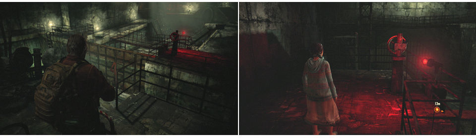 Enfrente de la puerta que ha subido Natalia, hay unos barrotes, tras ellos la vemos.Vamos a tener que ir con Natalia por arriba, abriendo las puertas a Barry por abajo, los enemigos se irán levantando a medida que avancemos, pero hay suficientes items para hacerles frente sin problemas, podemos aprovechar las bombonas para matar a los que por arriba vayan a por ella o abrirla el paso rompiendo objetos que la obstaculicen.