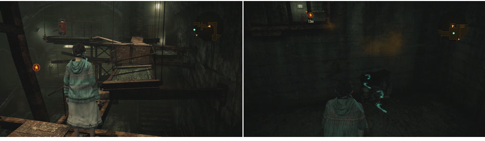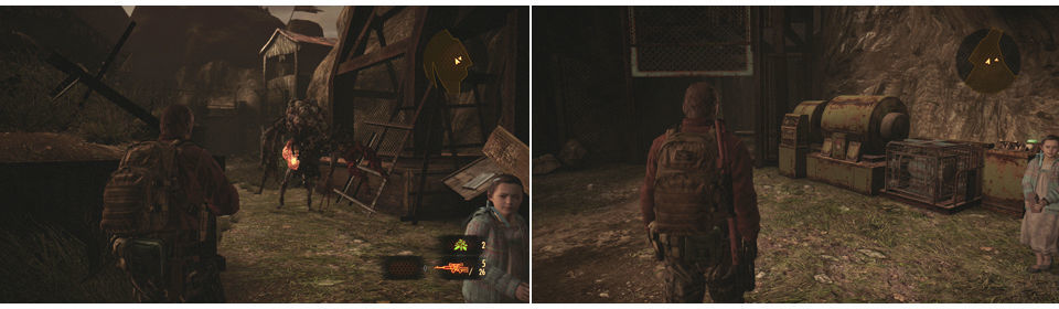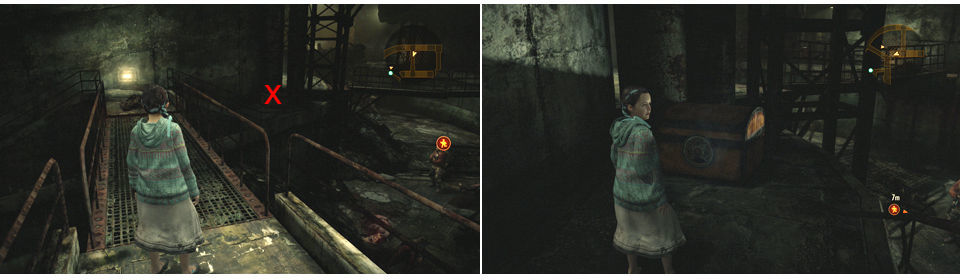 Antes de continuar por la puerta que hemos abierto, cogemos el generador y lo colocamos cerca de la palanca que activo Barry, sobre las escaleras rotas para subir, desde aquí llegaremos a la posición donde ha caído el cuerpo que disparamos antes al entrar en la zona.Llegamos a la zona donde estaba la puerta bloqueada por el otro lado, por la derecha con Natalia vemos unas huellas que nos indican el camino, colocamos el generador para auparnos, entrar en la habitación matar al Revenant de dentro y desbloquear la puerta para poder pasar con el generador y enviarlo por la cinta transportadora, una vez más lo mandamos por otra cinta y ya podemos ponerlo en el ascensor y activarlo, matamos al Revenant que baja dentro y subimos.