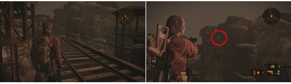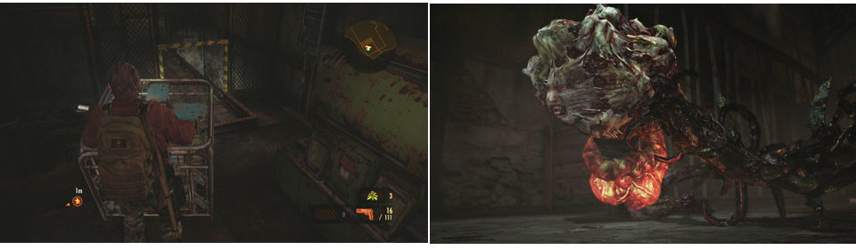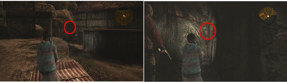 Al llegar a la zona donde Claire y Moira bajaban la puerta con la palanca para cruzar, debajo de las escaleras por las que saltaban.Ahora la zona esta sin agua, al fondo hay unas escaleras para continuar, cuidado con los Rottens, volvemos por la puerta que abrimos tras luchar contra el Vulcano, aquí si abrimos la válvula que había al lado del Vulcano saltando con Claire, tenemos los barrotes abiertos y podemos coger 2 coleccionables.