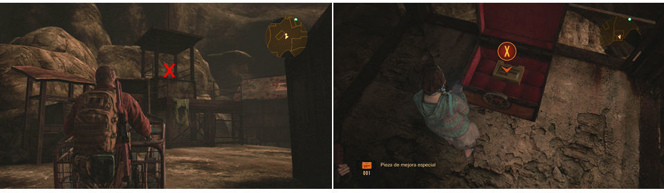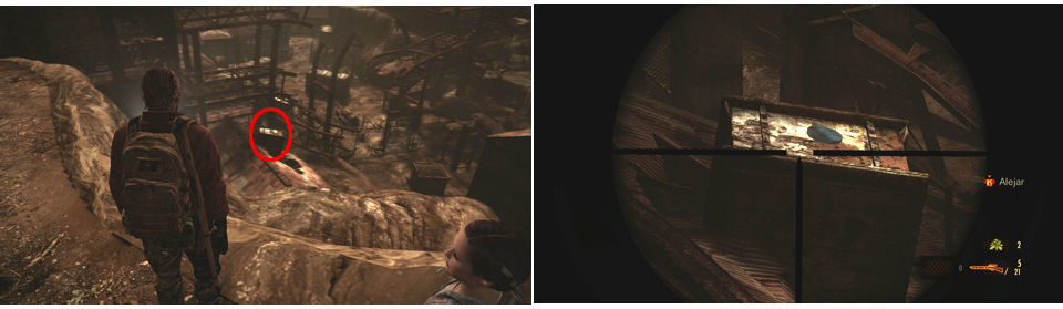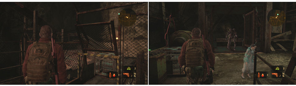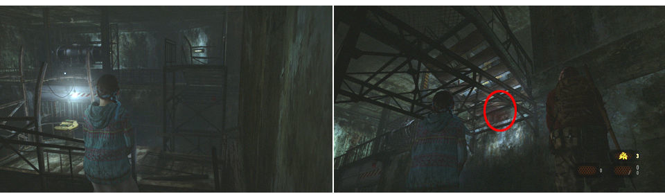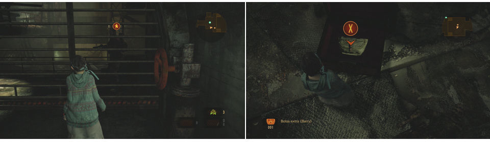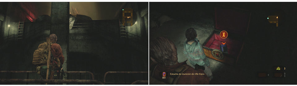 Donde estábamos luchando con Barry contra los Rotten y los Glasp, ahora que hemos abierto la compuerta puede ir Natalia a abrirla.Cruzamos la puerta azul a otra zona, continuamos por las pasarelas entre los pilares, hay varios items que recoger, al fondo hay 2 escaleras, por la izquierda continuamos, pero debemos ir a las de la derecha a recoger la caja 4.