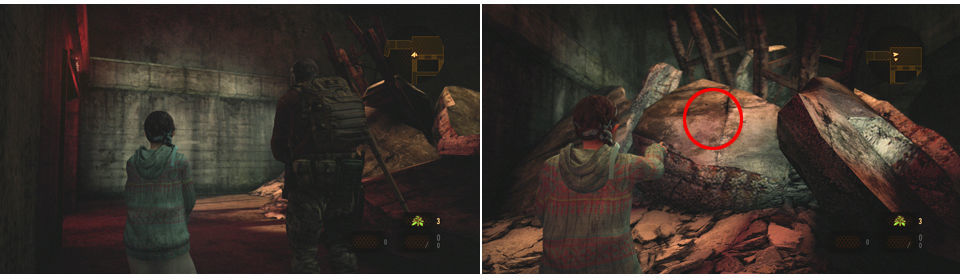 Ahora tras bajar las escaleras llegamos a una zona con una compuerta grande con un 4 y que aparentemente no podemos pasar, pero bajando y a la izquierda por donde el montón de piedras hay un agujero por donde se puede meter Natalia y abrir la compuerta a Barry, al lado de la válvula que abre Natalia encontramos el mapa.