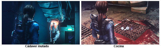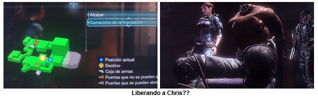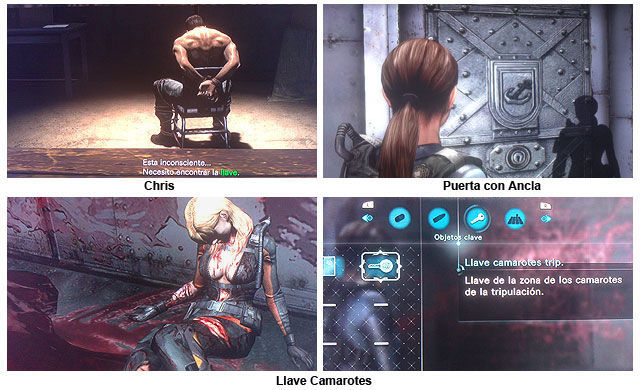 Ahora ya podemos avanzar por la puerta que se desbloqueó en la cocina, accedemos a un pasillo con 2 puertas, en la del fondo marrón vemos a Chris atado en una silla (nuevo objetivo encontrar la Llave), por la puerta azul subimos a la parte superior de los camarotes de la tripulación, atravesando las habitaciones con literas y los baños (nos ataca un Ooze) conseguimos llegar al otro lado del pasillo que nos bloqueaba unas cajas, aquí encontramos una puerta de hierro con la marca de un Ancla, y en el pasillo a la izquierda una puerta igual a la de donde esta Chris (cerrada) y una puerta que nos lleva hacia abajo a una especie de laboratorio donde vemos una secuencia donde 2 Oozes atacan a una mujer, los eliminamos y registrando el cadáver con el Génesis hayamos la "Llave camarotes tripulación".