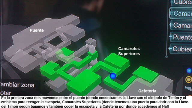 Continuamos en el puente donde nos quedamos, tras la secuencia nos piden que investiguemos el puente, tenemos unas escaleras que llevan hacia la parte inferior, aquí encontramos un ascensor que no funciona, en el pasillo del fondo una puerta de hierro con un Timón y a la derecha una sala de reuniones donde aparte de varios items hay una caja fuerte que requiere tarjeta y recogemos la llave del casco (en realidad es la llave del Timón) ahora podemos abrir las puertas que tenían un timón, teníamos una enfrente en el pasillo, dentro encontramos munición un cadáver y un emblema (que nos sirve para coger la escopeta en los Camarotes Superiores) y un mapa del barco, nuestro objetivo es ir a la sala de comunicaciones y poder mandar un mensaje.