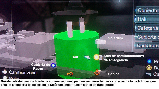 Entramos en el Hall, en una sala amplia con 3 pisos, los ascensores no funcionan, en el piso de arriba tenemos el Solárium, en el piso medio por el cuál accedemos desde la cafetería hay una puerta que pone Staff Only (Sala de Comunicaciones) con el símbolo de una Boya, es nuestro destino pero no tenemos la llave, en el piso inferior tenemos 2 puertas una con el símbolo de un Ancla que lleva al casino y otra que pone Promenade que nos lleva a la cubierta de paseo, a la derecha de esta entrada encontramos piezas de personalización, también tenemos una caja para equiparnos en el piso medio.
