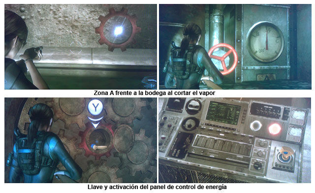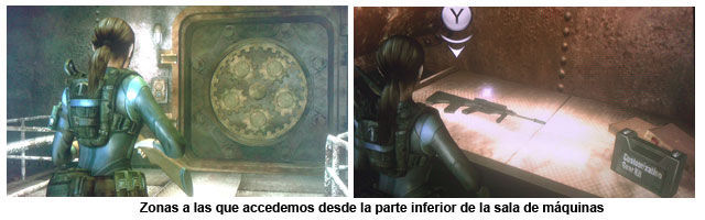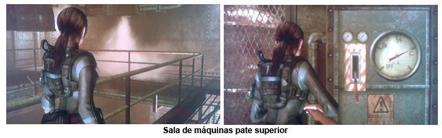 Al cruzarla vemos unas escaleras hacia abajo y sobre unas tuberías un morral de munición que no podemos coger, al bajar llegamos a una zona parcialmente inundada, , tras unos pasillos llegamos a la sala de control de los mamparos de emergencia pero no podemos activarlos sin restaurar la energía, tenemos que buscar la sala de máquinas, en esta sala tenemos una caja de armas.