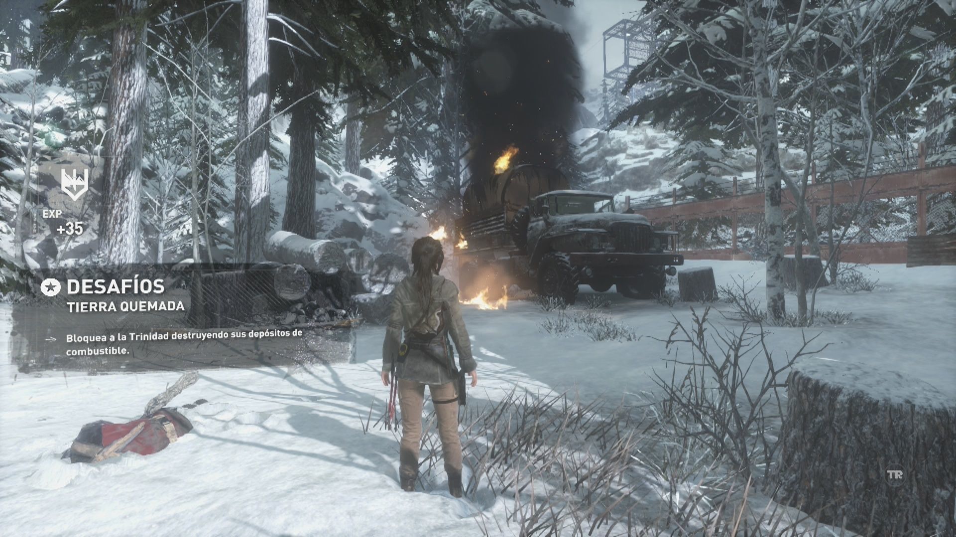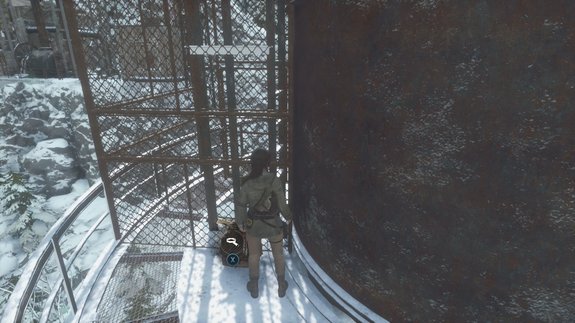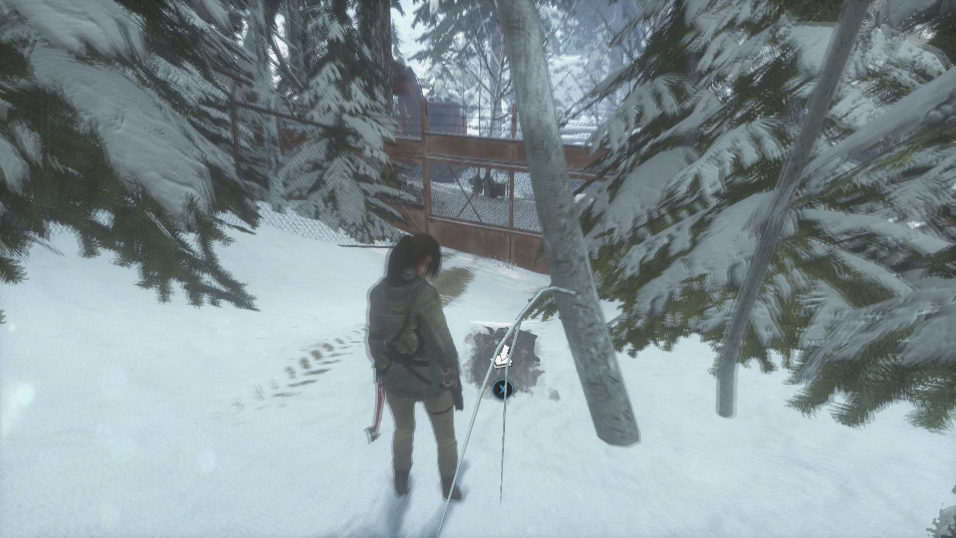Sigue de nuevo el camino principal hasta encontrarte con tres enemigos más y acaba con ellos. Un poco más adelante verás otra patrulla de tres enemigos, cuando acabes con ellos rodea el quita nieves por el lado izquierdo para encontrar un Mapa de archivista y sube por la pared de madera de la derecha para llegar a otra zona. Aquí verás un mayor número de enemigos y cuando acabes con ellos debes ir por el camino que va hacia la izquierda por el puente derruido para encontrar el Alijo de supervivencia 2 en un árbol de la derecha antes de llegar a la verja metálica.