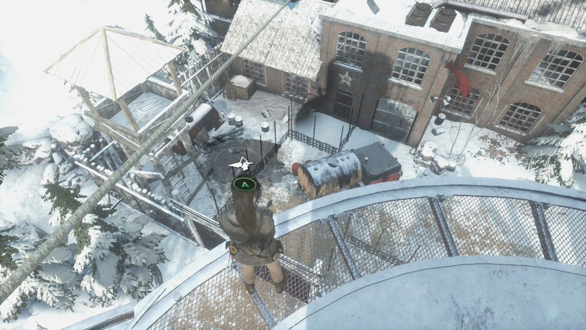 Al usar la segunda tirolina llegarás a lo alto de una torre, aquí tendrás que acabar con un enemigo e ir hacia la derecha para encontrar una mochila que debes examinar para encontrar una Cartera de explorador, también debes mirar hacia abajo para ver el Depósito 4 que debes hacer explotar para cumplir el desafío de esta zona antes de usar la siguiente tirolina que te lleva a la planta superior del siguiente edificio.