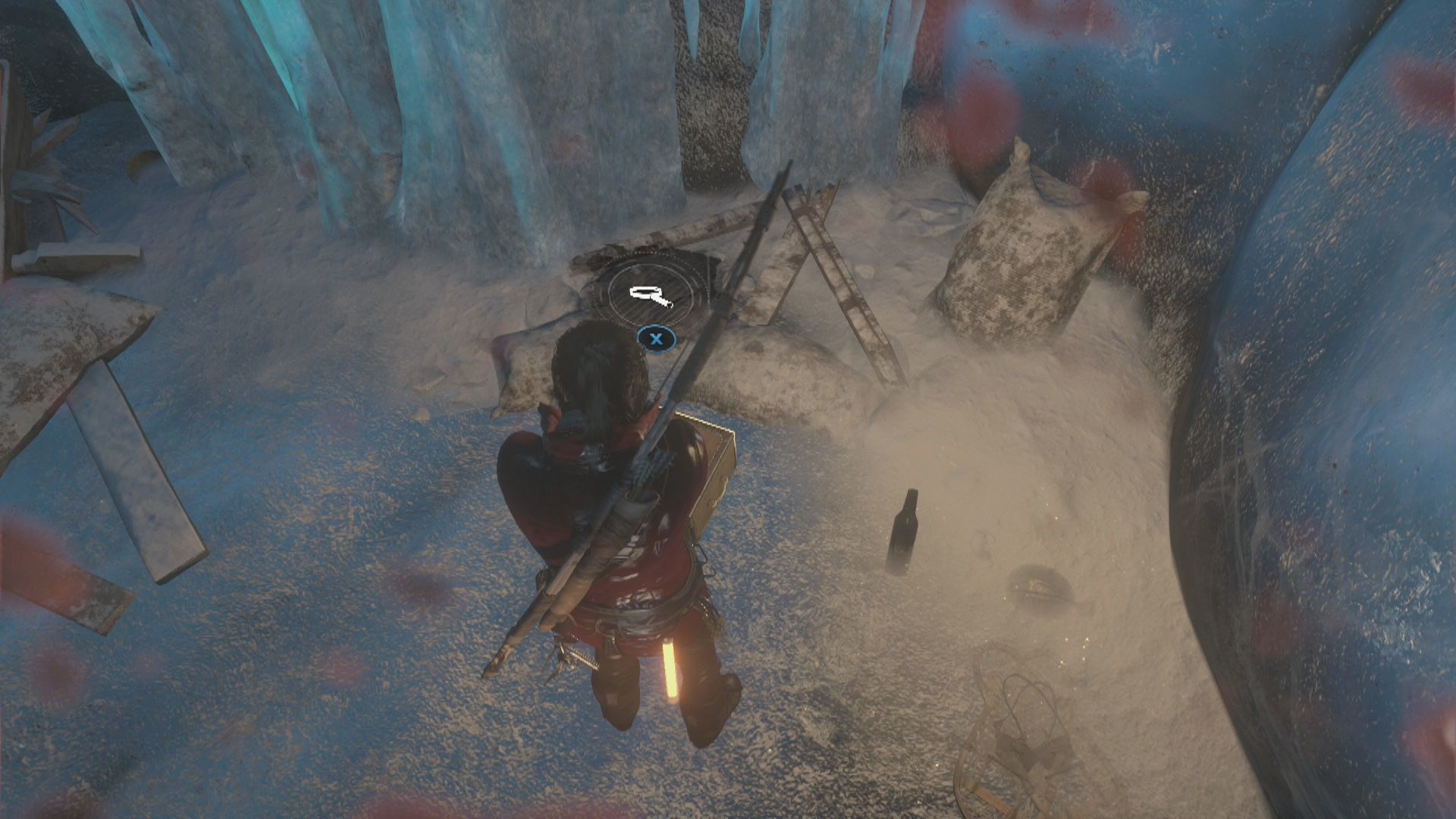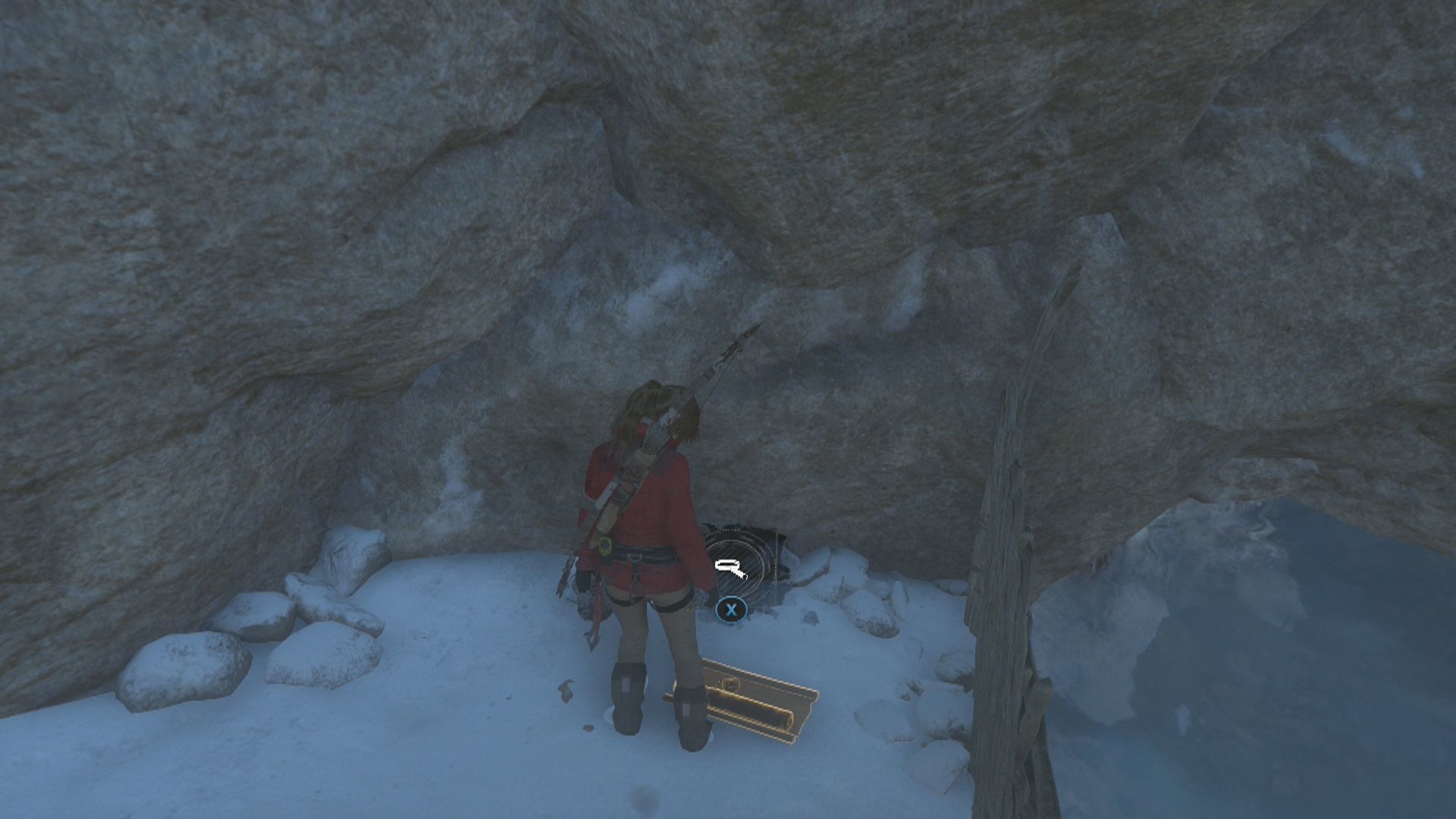 Sigue el camino de la cueva hasta llegar a la zona de la Tumba de desafío. Rodea la zona por la derecha y salta a la roca de la entrada de la tumba. Entra en la tumba y salta al mástil para llegar a la zona baja de la tumba. Usa el piolet para mover la rueda central hasta que baje un contrapeso, coge el Documento 3 junto a la rueda y salta por la pared de madera. Avanza por el mástil y salta en el contrapeso para romper la pared de hielo. Sube por la pared de la derecha y usa de nuevo el piolet en la rueda para hacer bajar hasta el máximo el otro contrapeso. Suelta la rueda y corre por el mástil para saltar al contrapeso antes de que vuelva a su posición y así romperás la pared de hielo de la izquierda. Escala por la pared de la izquierda y luego por las maderas hasta llegar a la parte superior de la cueva. Una vez arriba examina el altar para completar la tumba y conseguir una Habilidad ancestral y el logro Todo un desafío. A la derecha de las escaleras que llevan al altar encontrarás el Documento 4, el Mapa archivista y unas flechas. Más a la derecha verás una tirolina que debes usar para volver a la anterior zona de la cueva y nada más caer mira a tu izquierda para ver una caja que contiene la Reliquia 3.