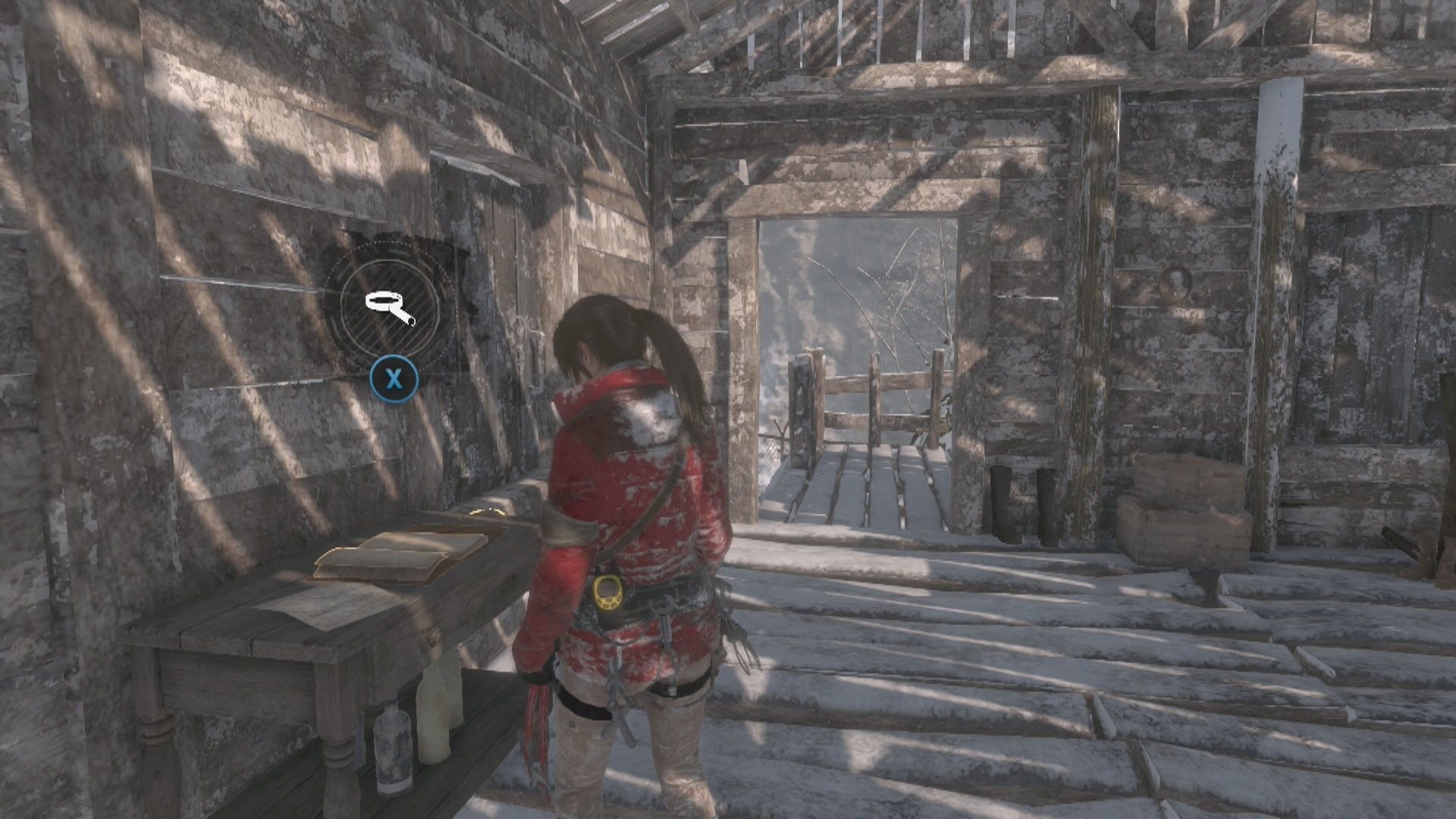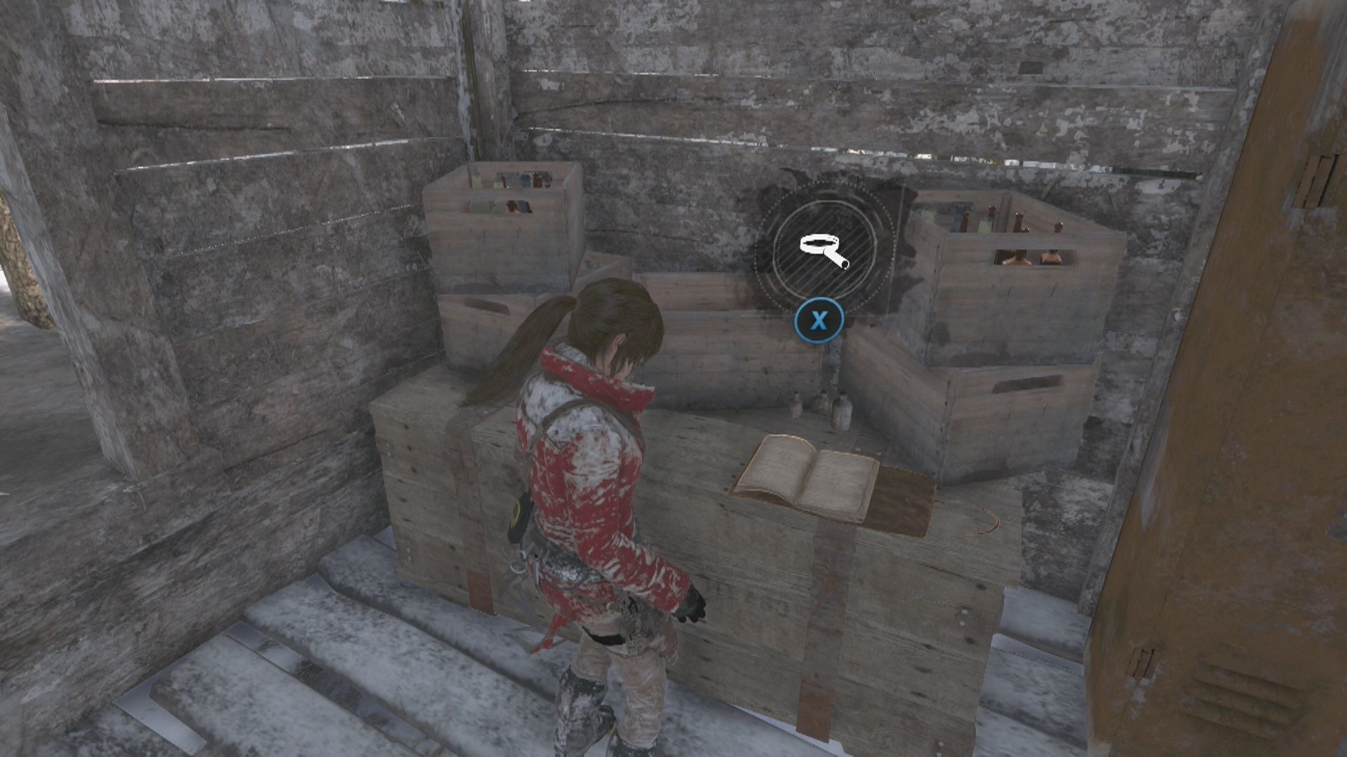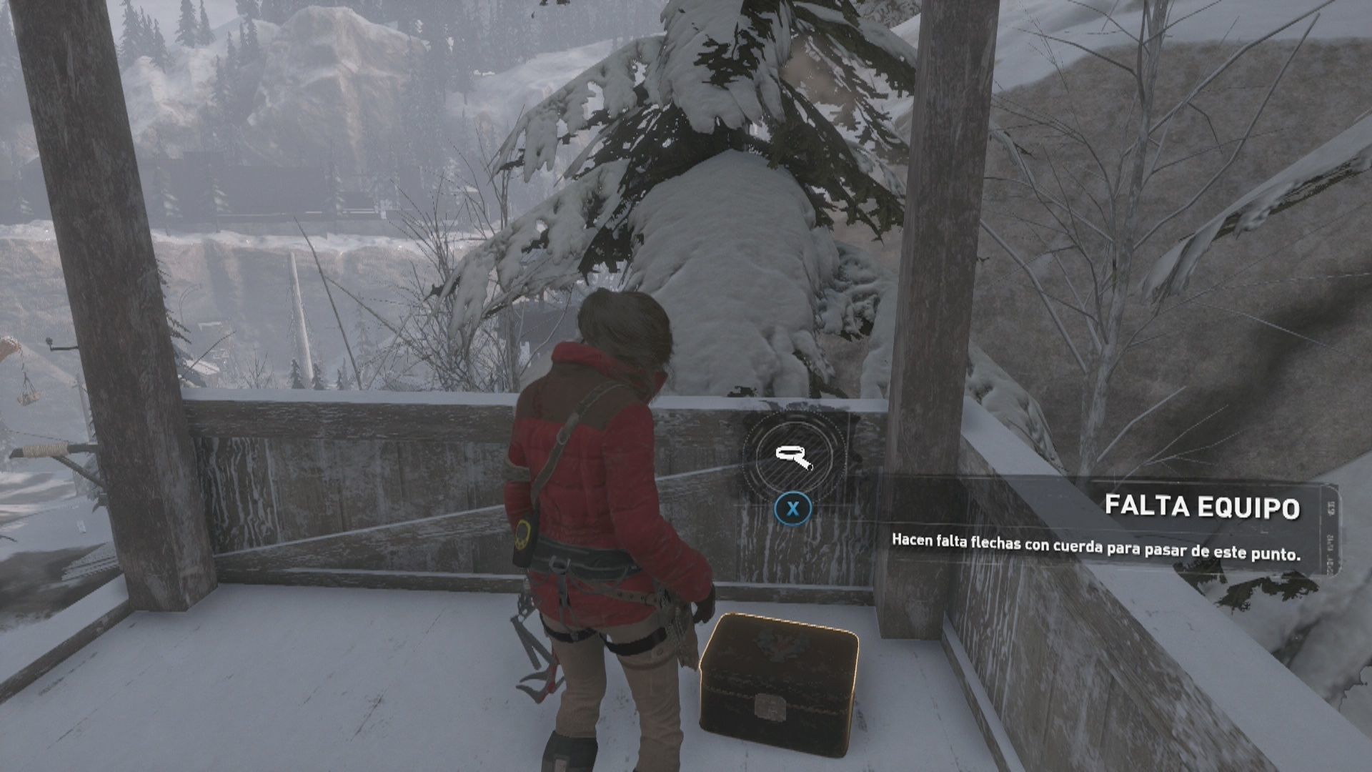 A la derecha del campamento encontrarás el Alijo de monedas 1 junto a una verja. En uno de los laterales de la cabaña junto al campamento verás el Mural 7, abre la puerta de la cabaña usando el piolet para desbloquear un almacén de suministros y sal por el otro extremo para encontrar el Documento 10 encima de una caja de suministros. Sube por la escalera de mano que tienes a tu izquierda y usa la tirolina para llegar a la zona de aterrizaje del avión.