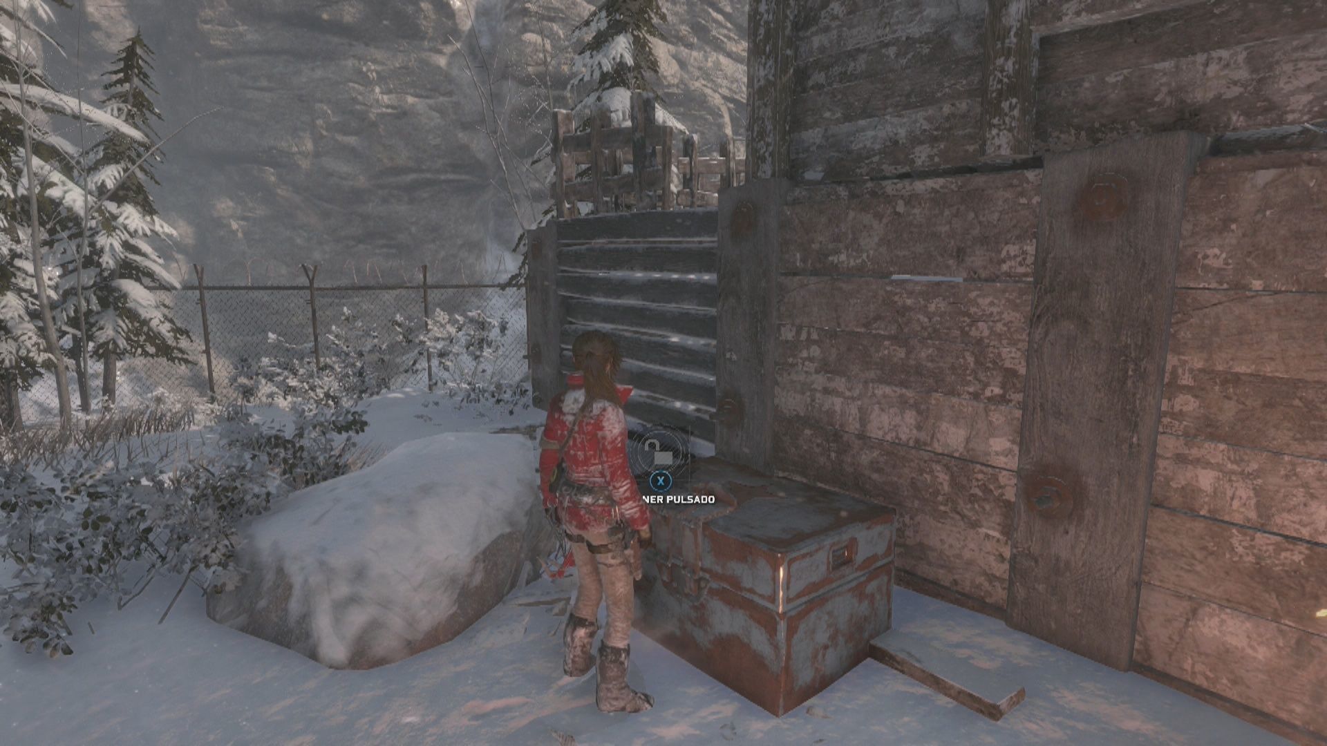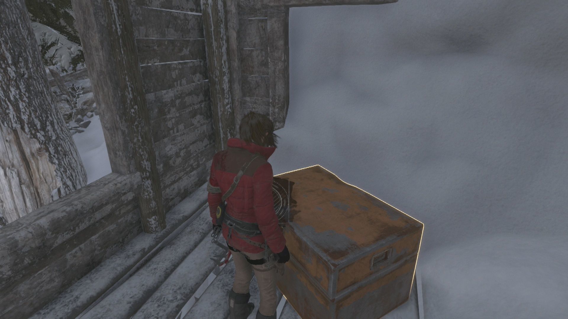 Desde aquí ve hacia el noroeste cruzando por un árbol caído. Sube a la torre de vigilancia de la izquierda para encontrar la Reliquia 6, dentro de la cabaña encontrarás el Baúl 4 y una caja con restos dentro y fuera de la casa.