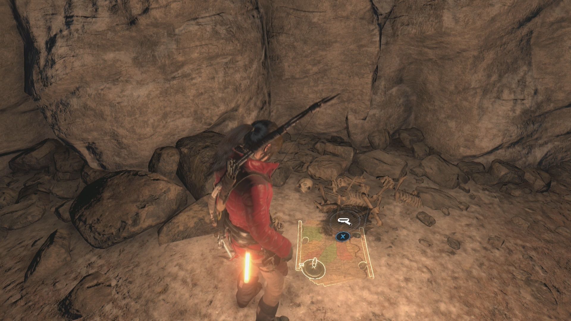 Vuelve a la entrada de la tumba. Ve hacia la derecha y entra en la cueva de la montaña para encontrar la cuarta cripta del desafío, acaba con los lobos y coge el Mapa de archivista en el fondo de la cueva antes de volver a salir.