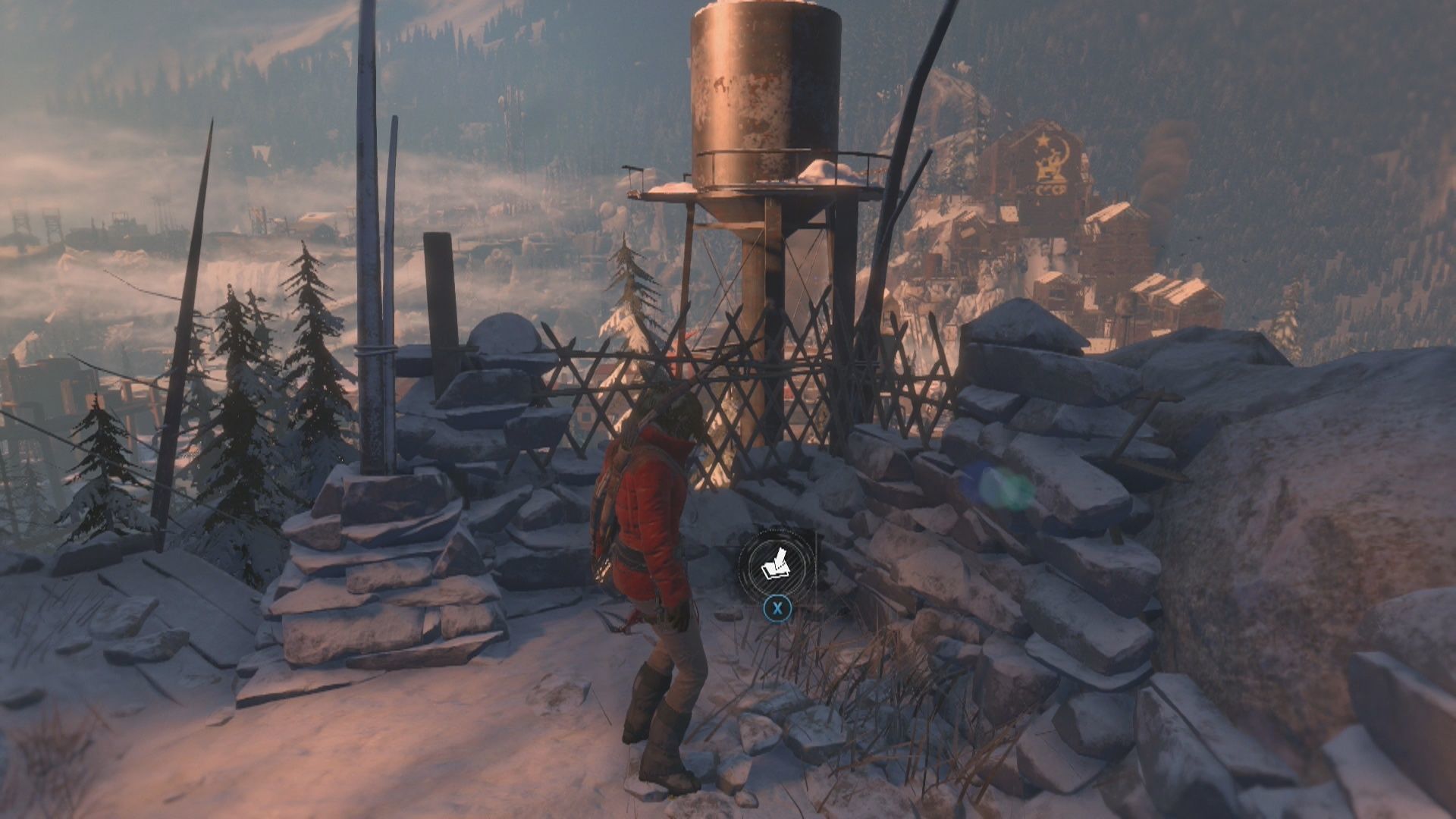 Ve a la torre cercana a la casa, abre unas cajas con restos y escala por la torre. Arriba encontrarás más objetos y también un nido de pájaros que puedes examinar antes de usar la tirolina para llegar dentro del campamento enemigo.