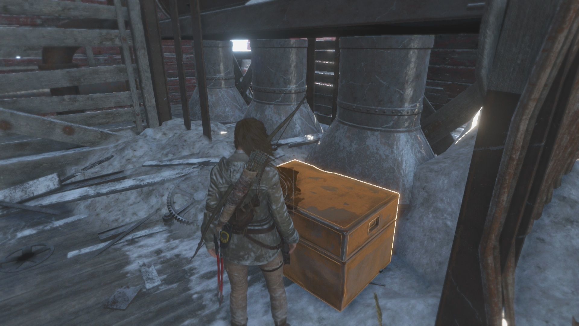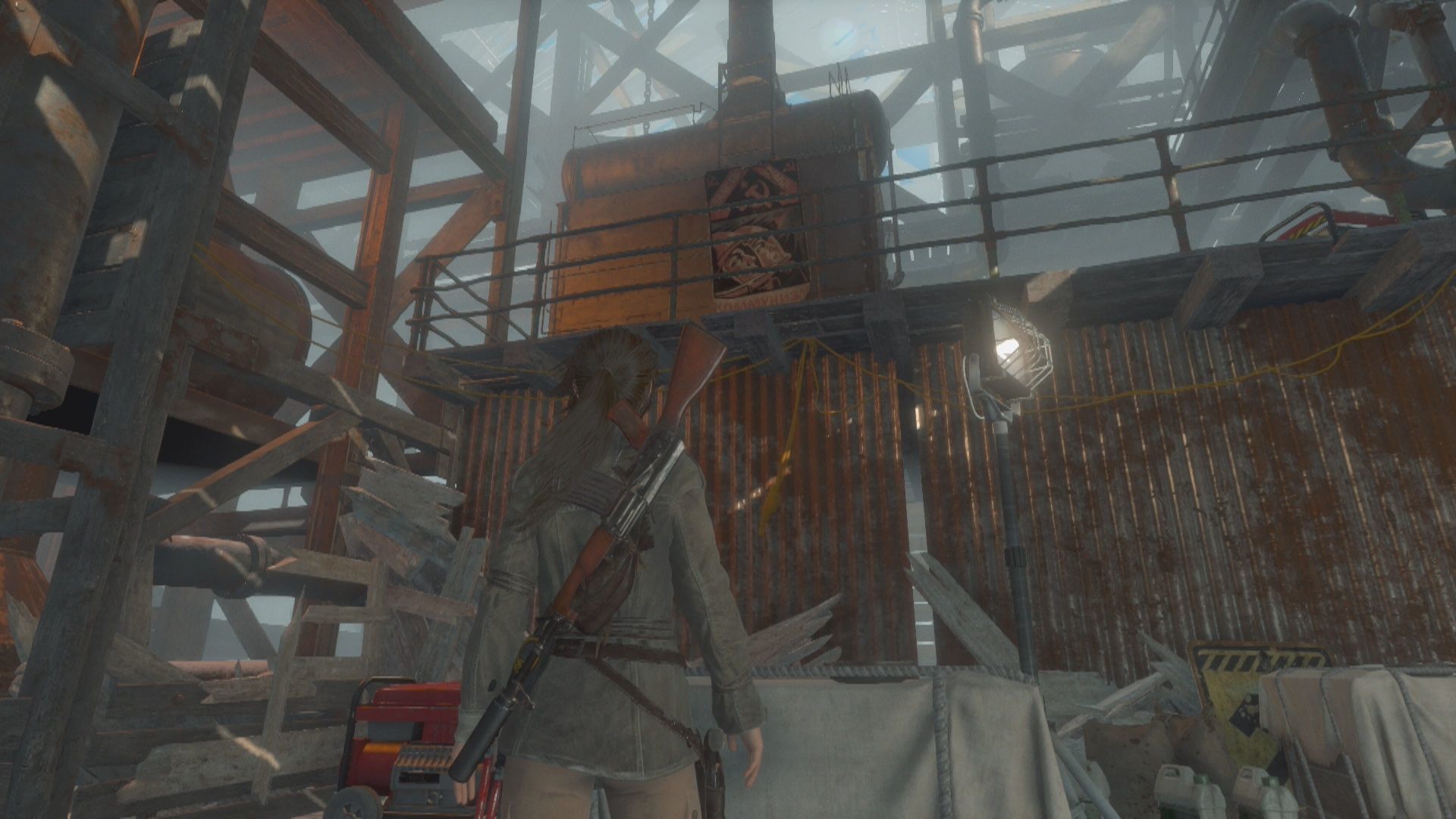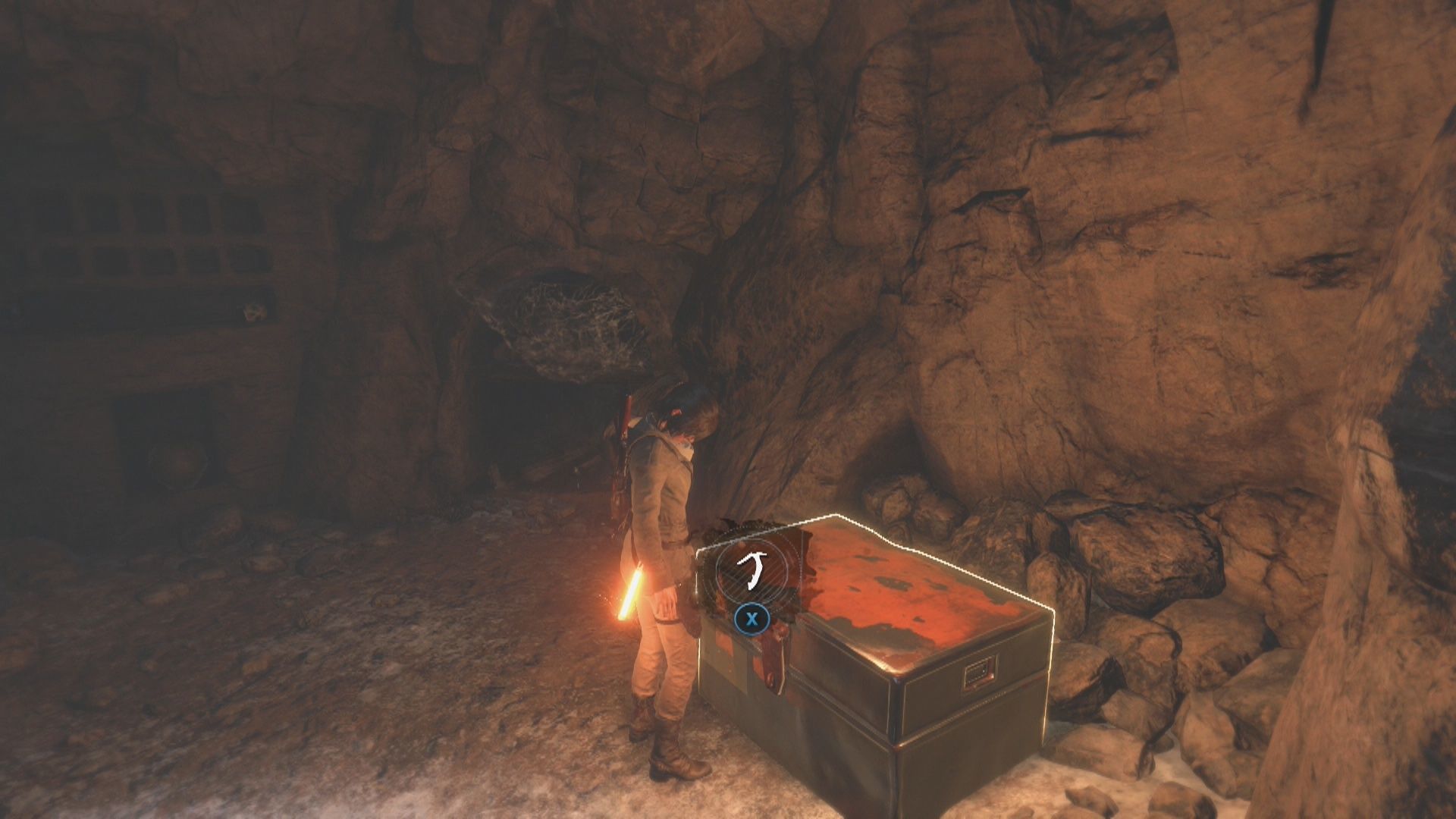 Salta a la zona de la izquierda y sube las escaleras de la izquierda para llegar hasta una mesa en la que encontrarás el Documento 21. Al bajar las escaleras mira hacia la izquierda y detrás del vagón encontrarás una mochila de explorador que contiene una Cartera de explorador. Sigue el camino por la cueva hasta subir una escalera, coge el mineral del suelo y al subir la siguiente escalera mira a la derecha para abrir una caja que contiene la Reliquia 14. Sigue el camino por el pasillo que va hacia el fondo de la zona para encontrar el Documento 22 encima de un escritorio y abre la taquilla de la derecha para conseguir algunos objetos. Date la vuelta, sube por las maderas para llegar hasta el tejado de este último pasillo y mira a tu derecha para encontrar el Mural 10. Vuelve a bajar y salta al montacargas que está lleno de piedras para hacer que los vagones rompan la estructura de la fachada. Desde la plataforma de la izquierda tendrás que tirar de otro vagón para que quede parado en uno de los montacargas, sube al tejado de la estructura y ata el vagón a la madera. Vuelve a saltar al montacargas de antes y el vagón que está atacado detendrá la caiga del agua. Déjate caer y usa un coctel molotov para romper las telas que cubren una entrada y salta. Aquí encontrarás varios objetos y también el altar que debes examinar para completar la tumba y conseguir la Habilidad ancestral Ojos brillantes. Sigue por el túnel y en la zona de la excavación mira en el lado izquierdo para encontrar el Alijo de supervivencia 17. Escala por la pared y sigue el camino de vuelta hasta volver a la zona de la refinería donde acabaste con los últimos enemigos.