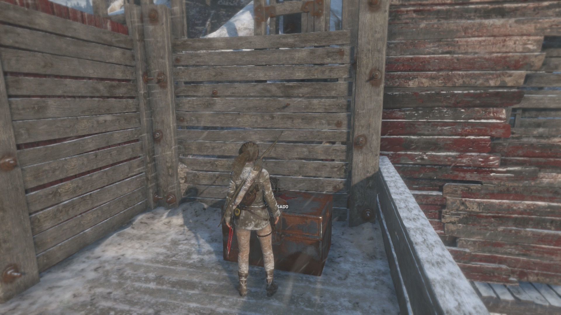 Vuelve al poste del rio por el que acabas de cruzar para llegar a esta zona. La estructura de madera que tienes al lado tiene una parte destruida y en el suelo puedes ver las maderas, junto a ellas encontrarás un el Alijo de supervivencia 9. Un poco al norte del punto de la misión principal encontrarás una cueva bloqueada por unas tablas que puedes quitar tirando de ellas para entrar en la quinta cueva para completar el desafío y de paso y encontrar el Baúl 7.