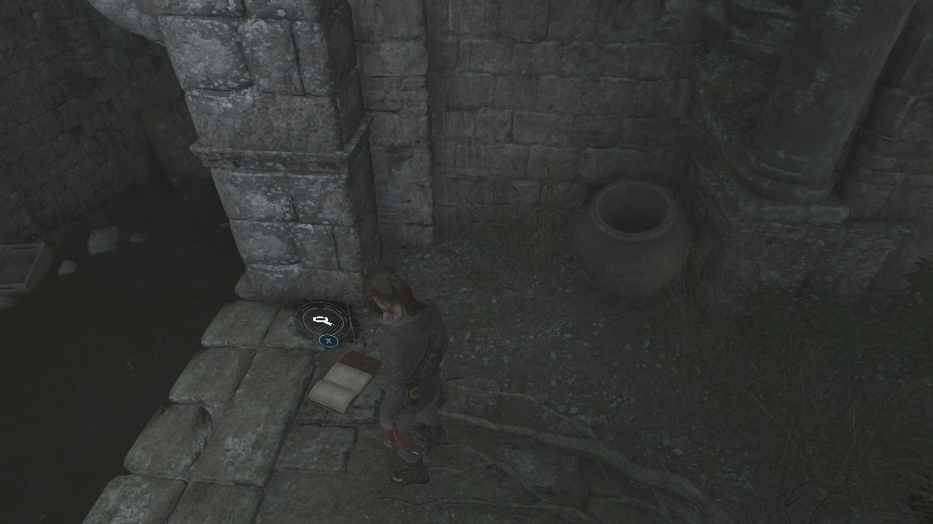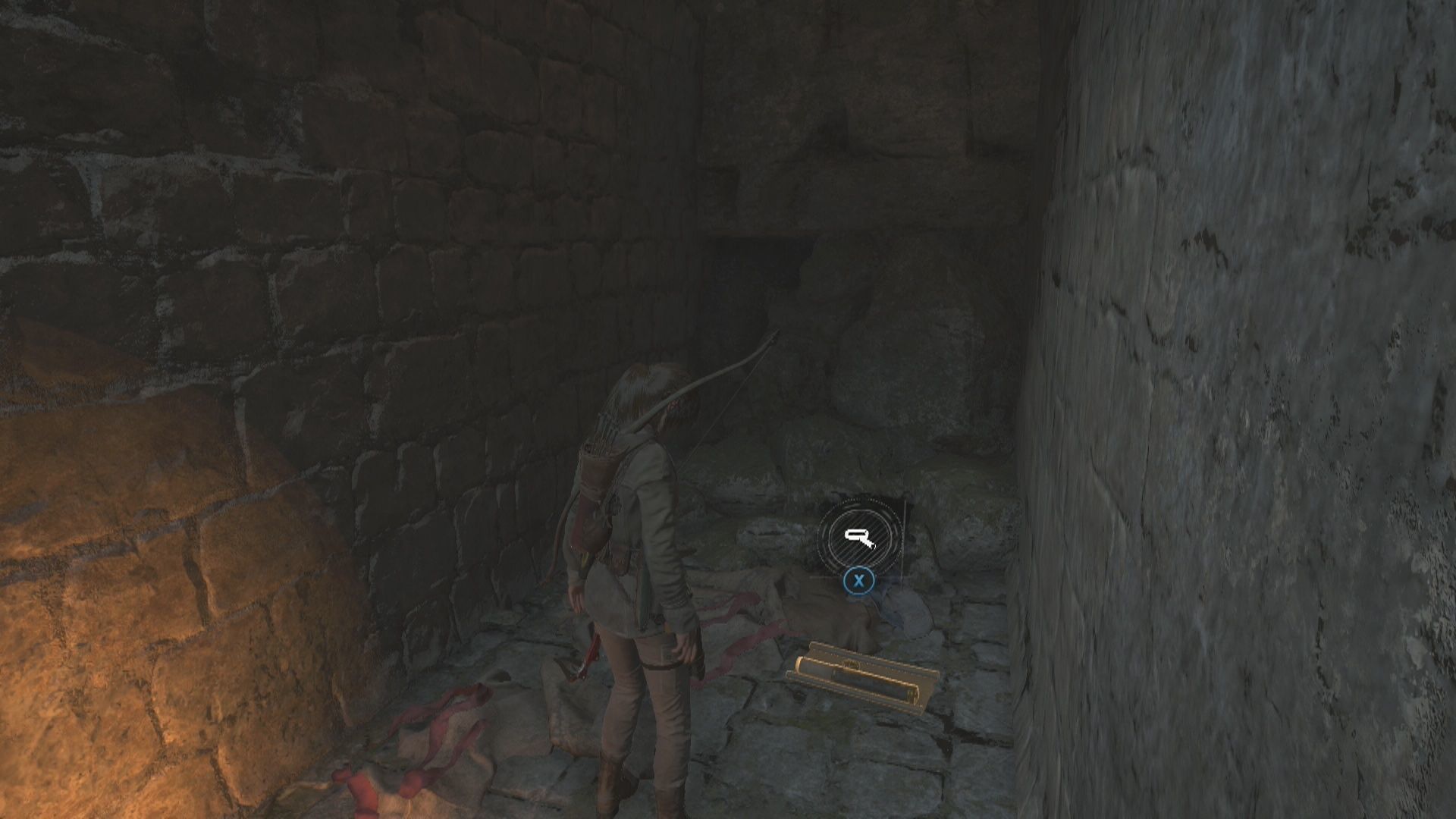 Cuando acabe la siguiente escena estarás en un patio exterior. Sube la escalera y coge el Documento 5 encima de la mesa, examina el Monolito para conseguir la localización de tres monedas, el Alijo de monedas 1 lo tienes justo al lado de la puerta que estaba bloqueada. Vuelve al campamento anterior y sube las escaleras de la izquierda, cruza por las tablas y mira a tu izquierda para ver el Documento 6. Antes de seguir avanzando usa el viaje rápido en el campamento para viajar al primer campamento de esta zona y recoge el Alijo de monedas 2.