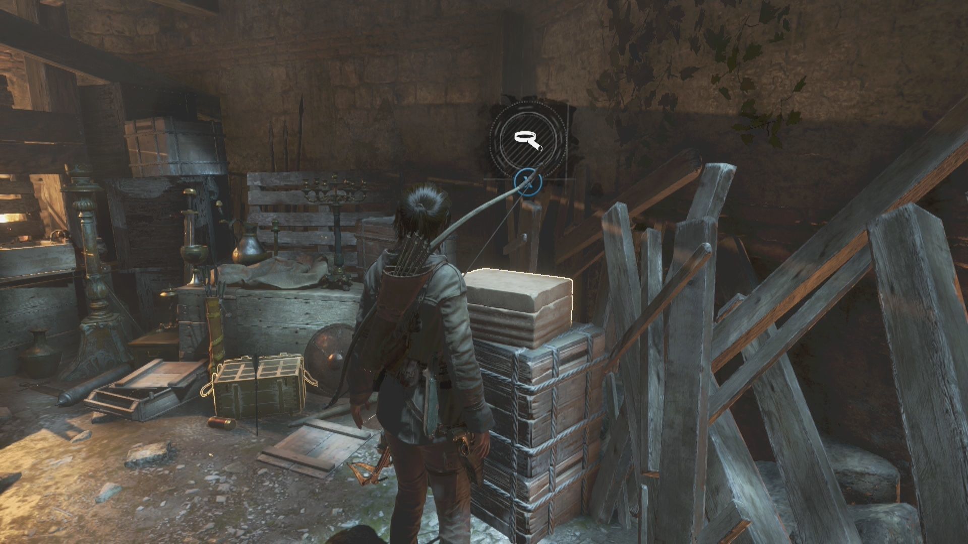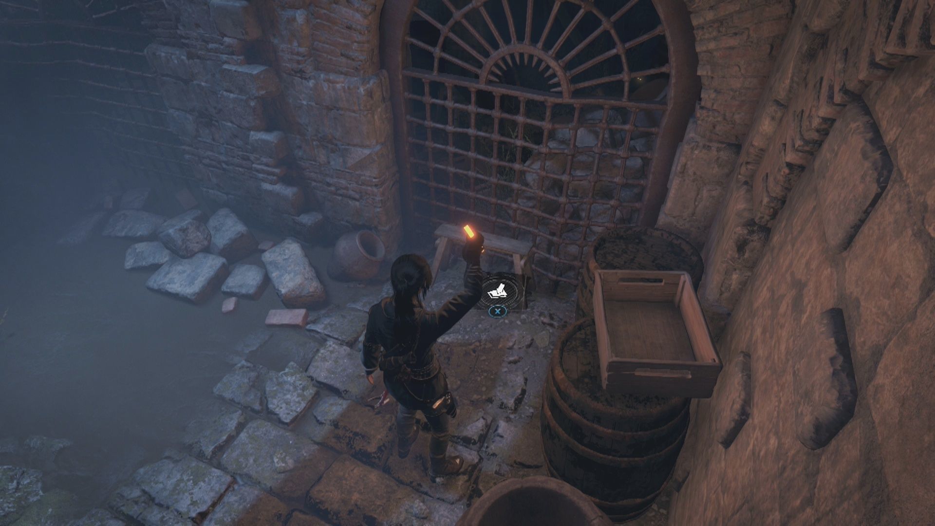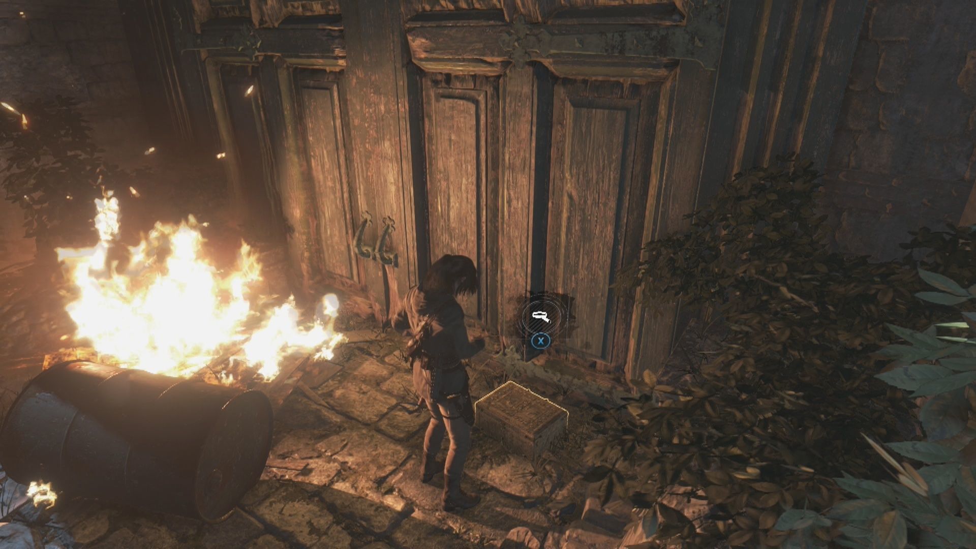 Rompe el muro de ladrillo de la izquierda y avanza. Al caer mira a la izquierda para ver el Mural 1 y escala por la pared de madera. Cuando acabe la escena déjate caer por el lado izquierdo y cuando acabe la escena abre la caja que ves a la derecha para encontrar la Reliquia 2. Vuelve a subir y haz bolar el bloqueo de la puerta haciendo uso de tu nueva herramienta.