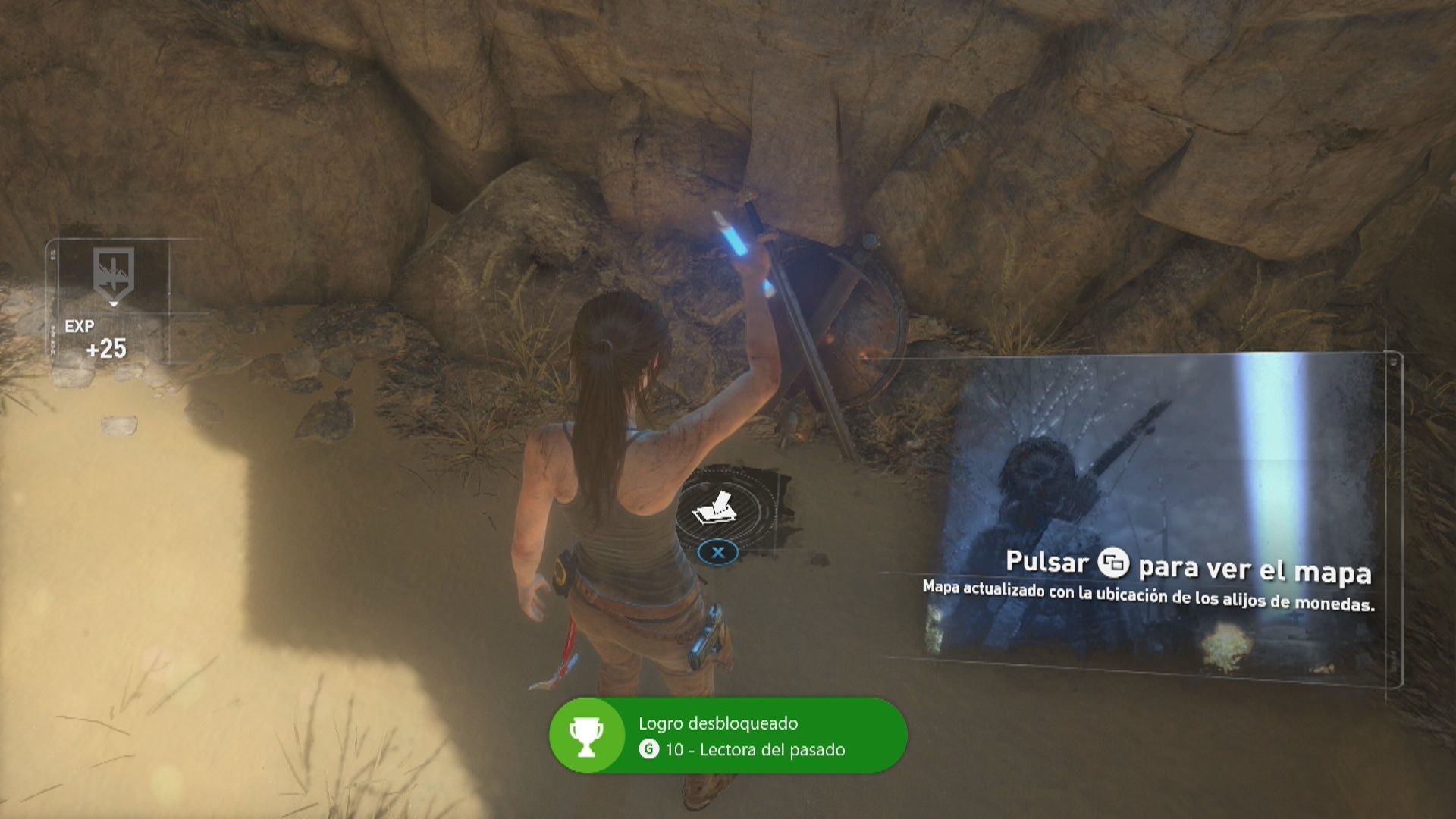 Una vez que acabe la cinemática debes examinar el Mural 1, Mural 2, Mural 3 y Mural 4 de la zona para aumentar tu nivel de lenguaje. Cuando lo hayas subido examina el monolito central para conseguir la localización del Alijo de monedas 1 y el logro Lectora del pasado. Usa el piolet para abrir el camino y sal de la cueva.