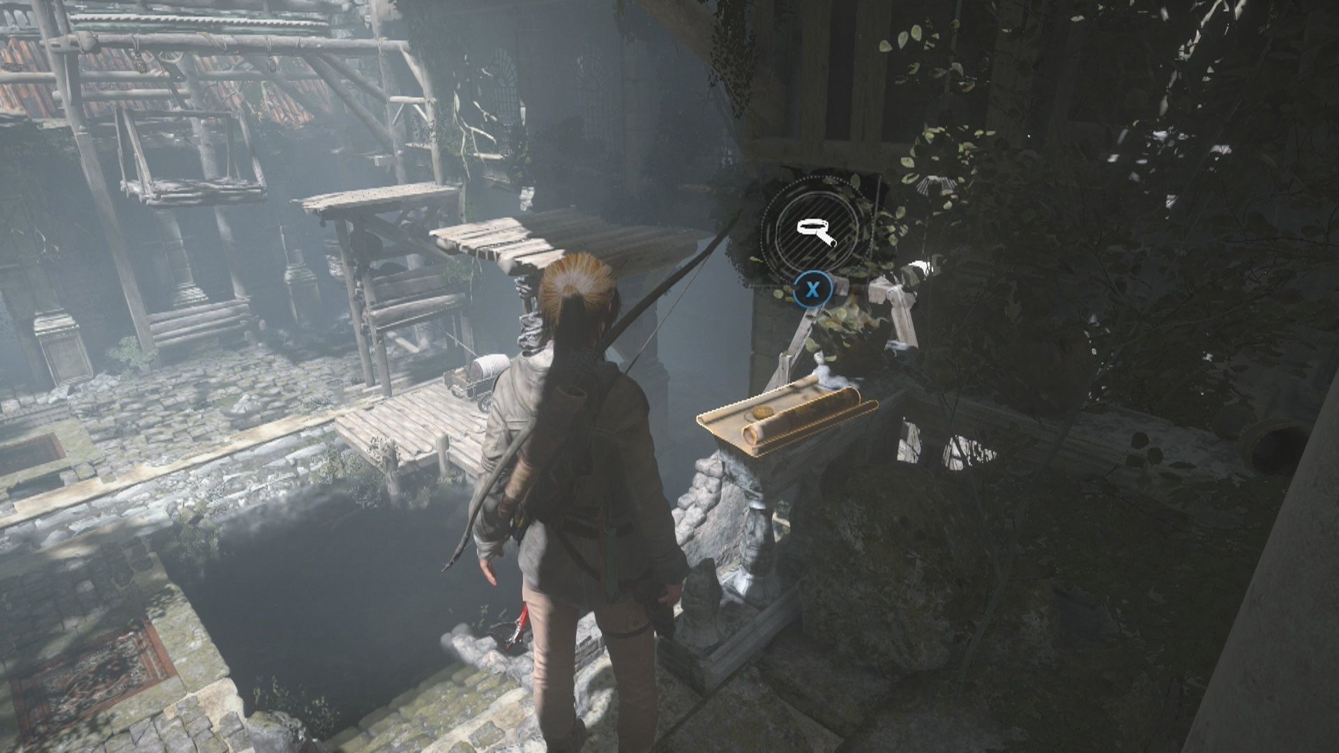 Vuelve a la primera zona. Ve a la zona de la izquierda de la reliquia y usa una cuerda para atar el contrapeso con la plataforma. En el zona de la izquierda verás un carro que debes empujar para sacarlo. Usa una flecha en la palanca que ves arriba para tirar de ella y hacer que baje el recipiente redondo y antes de que vuelva a subir usa una cuerda en el carro para atarlo. Vuelve a la escalera y sigue el recorrido por arriba hasta subir por un saliente. Nada más subir mira a tu izquierda para encontrar el Documento 8. Entra en la cámara, coge el Mapa de archivista en la mesa de la derecha y examina el altar para completar la tumba y conseguir la Habilidad ancestral Sanadora ágil.
