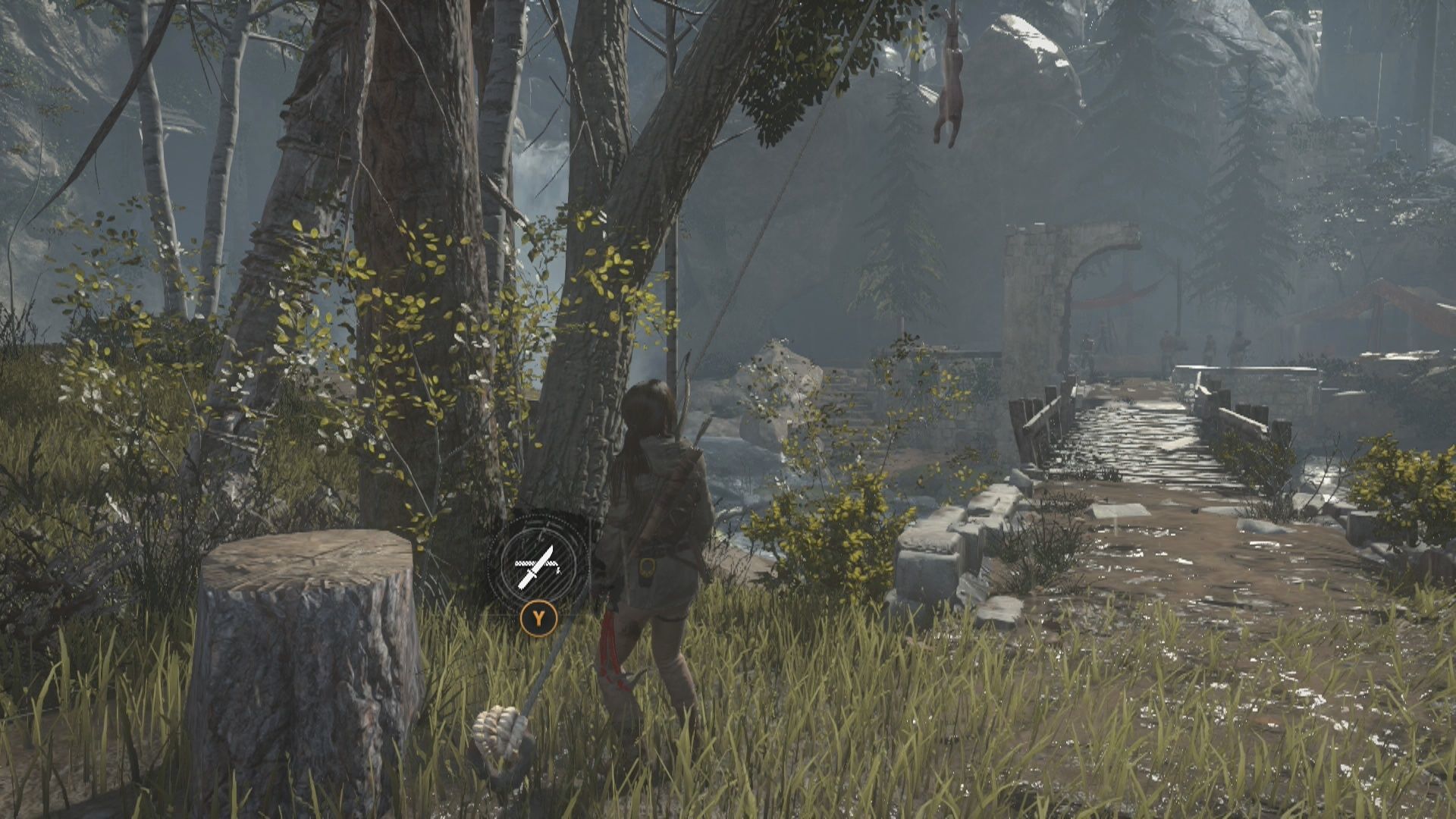 Vuelve una vez más al campamento y sigue el camino que va hacia el norte. Antes de cruzar el puente de madera mira bajo la segunda sección para ver la Diana 7. Sigue este camino hasta usar la cuerda para cruzar al otro lado, nada más cruzar mira a la izquierda para ver una mochila que contiene una Cartera de explorador. Sigue el camino pasando por el hueco del muro de piedras y prepárate para acabar con algunos lobos. Cuando esté tranquila la zona mira hacia la derecha según llegaste para ver la Diana 8 colgando de un árbol y abre la verja que ves a tu izquierda para llegar a la primera tumba de esta zona.