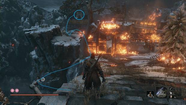 Nada más subir, dirígete a la derecha, a través de las llamas. Al fondo, junto a un bloqueo ardiendo por completo, verás un Ídolo, que cuando lo tocas te lleva directamente a la zona donde luchaste contra Gyobu. Aquí habrá esperándote... "algo".