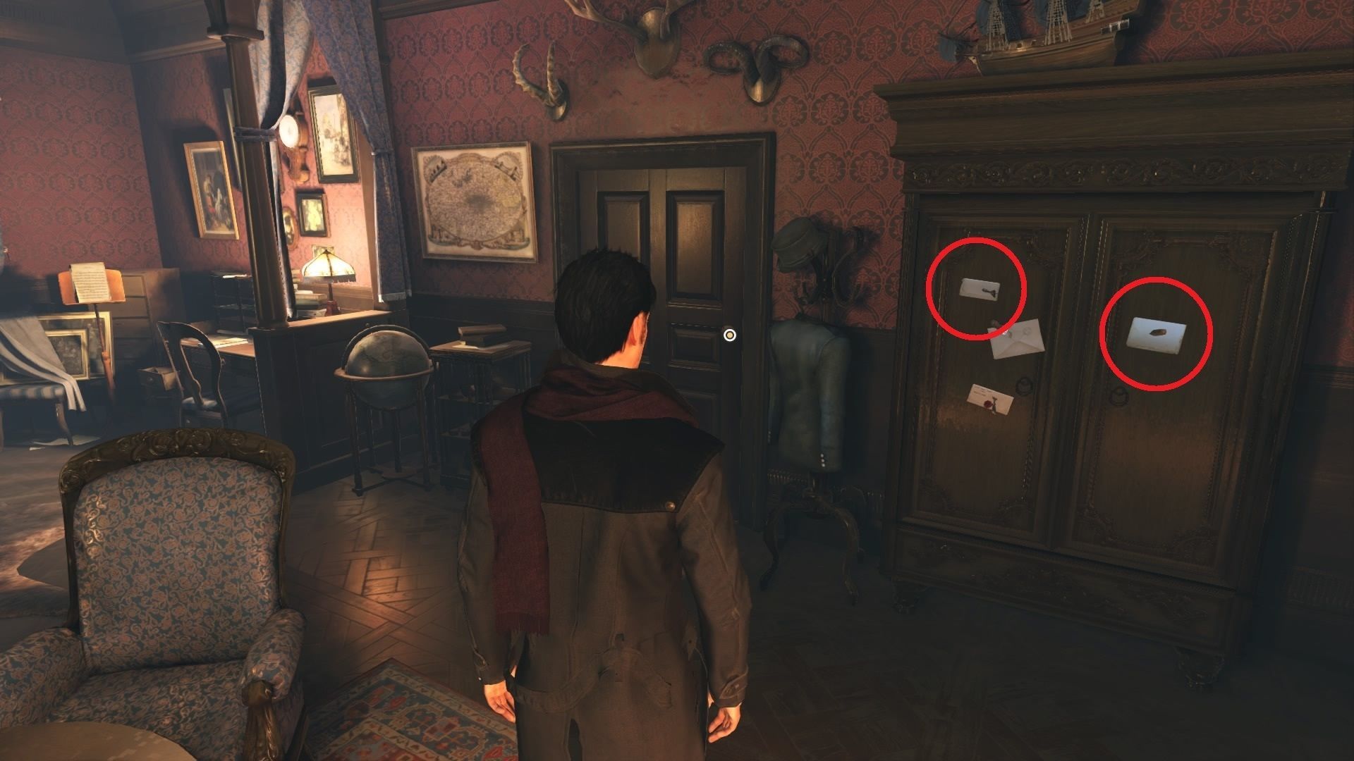 Examina la ventana, el jarrón roto y la butaca tumbada. Activa el talento de imaginación y marca los siguientes objetos: retrato de William Hamilton, velas bajo la silla, grimorio, tablero de espiritismo y fonógrafo. Valida la selección con el botón que se te indica en la esquina superior.