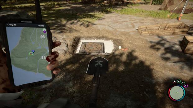 Cuando ya tengas la pala podrás acudir a la posición donde te hemos indicado y encontrarás un trípode junto a unos ataúdes de madera al lado de un terreno de tierra en el que debes excavar con tu pala para descubrir la escotilla de entrada al búnker de "mantenimiento B":